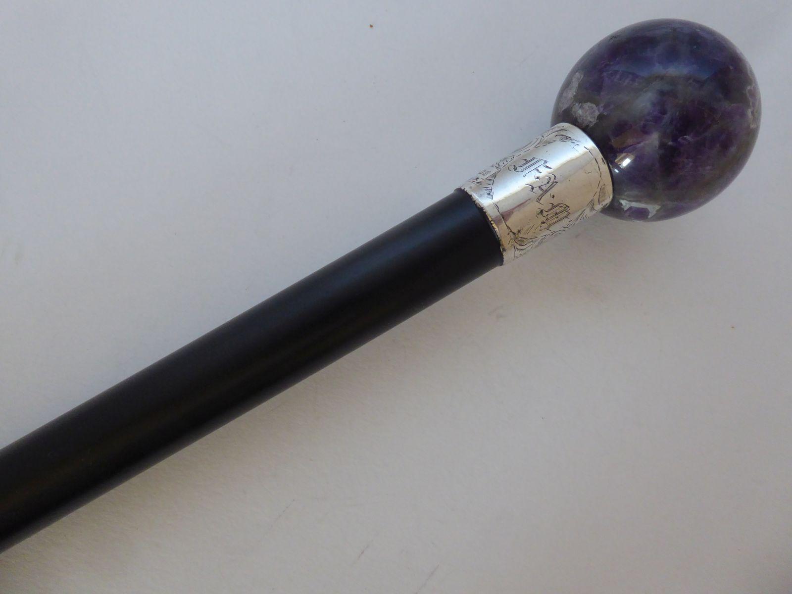 Walking Stick Cane 1910 Hallmarked Solid Silver Collar Ebonised Amethyst Pommel