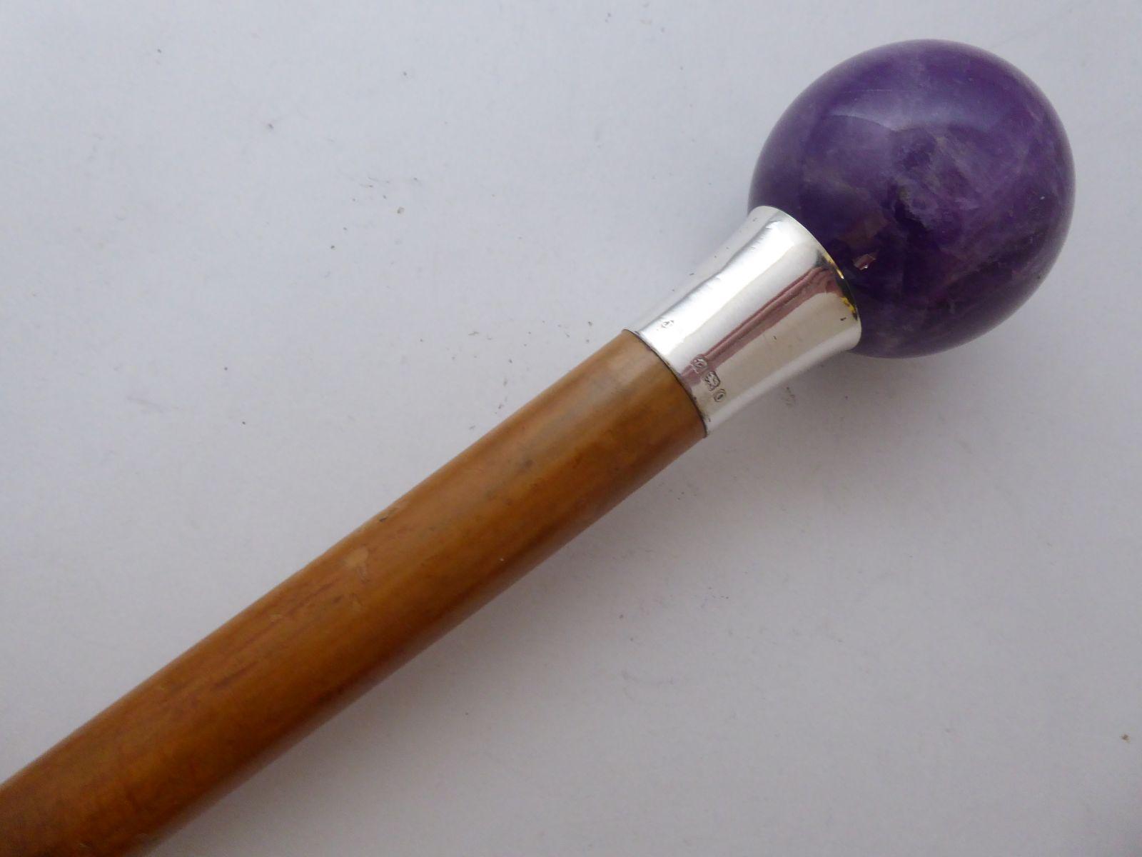 Walking Stick Cane 1913 Hallmarked Solid Silver Collar Malacca Shaft Amethyst Pommel