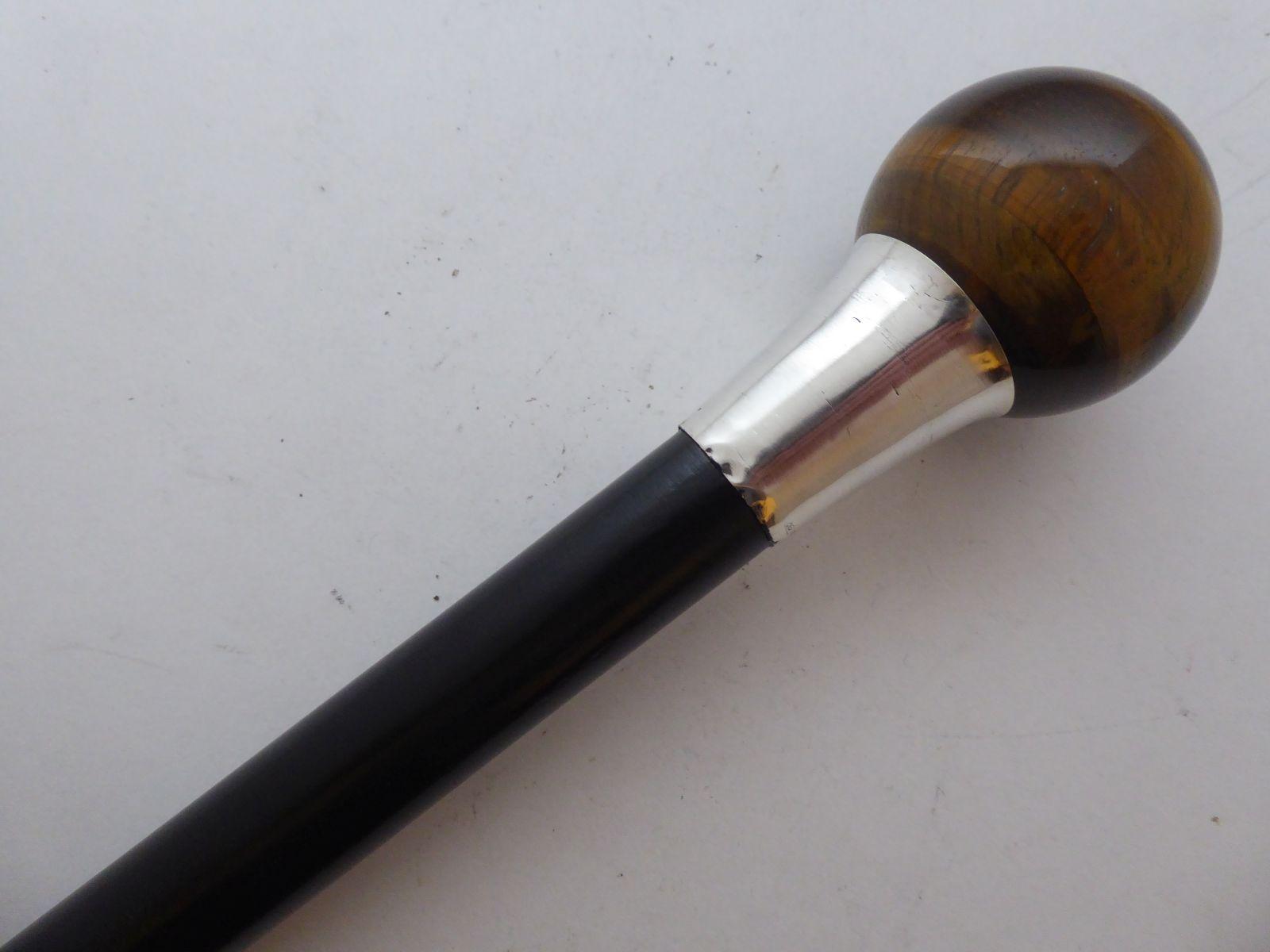 Walking Stick Cane 1914 Hallmarked Solid Silver Band Ebony Shaft Tigers Eye