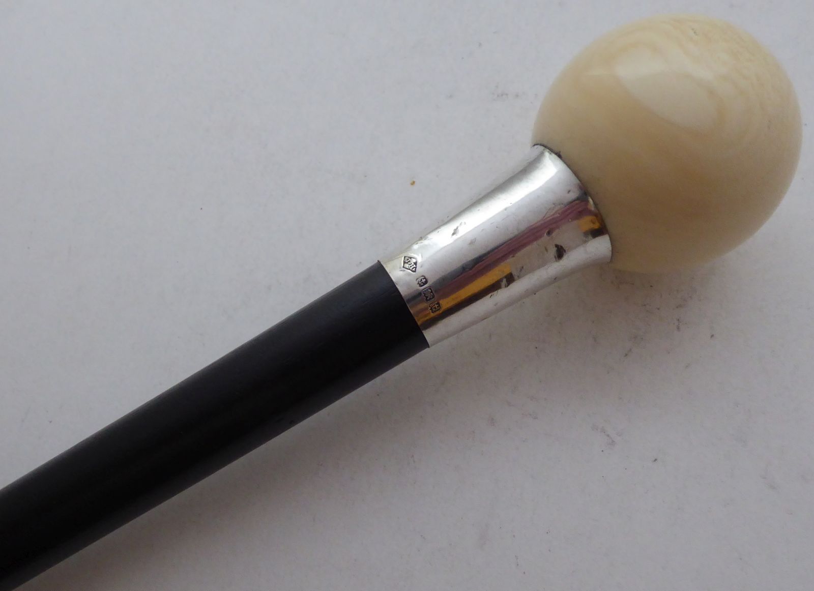 Walking Stick Cane 1918 Solid Silver Collar Tagua Nut Pommel Ebony Wood Shaft