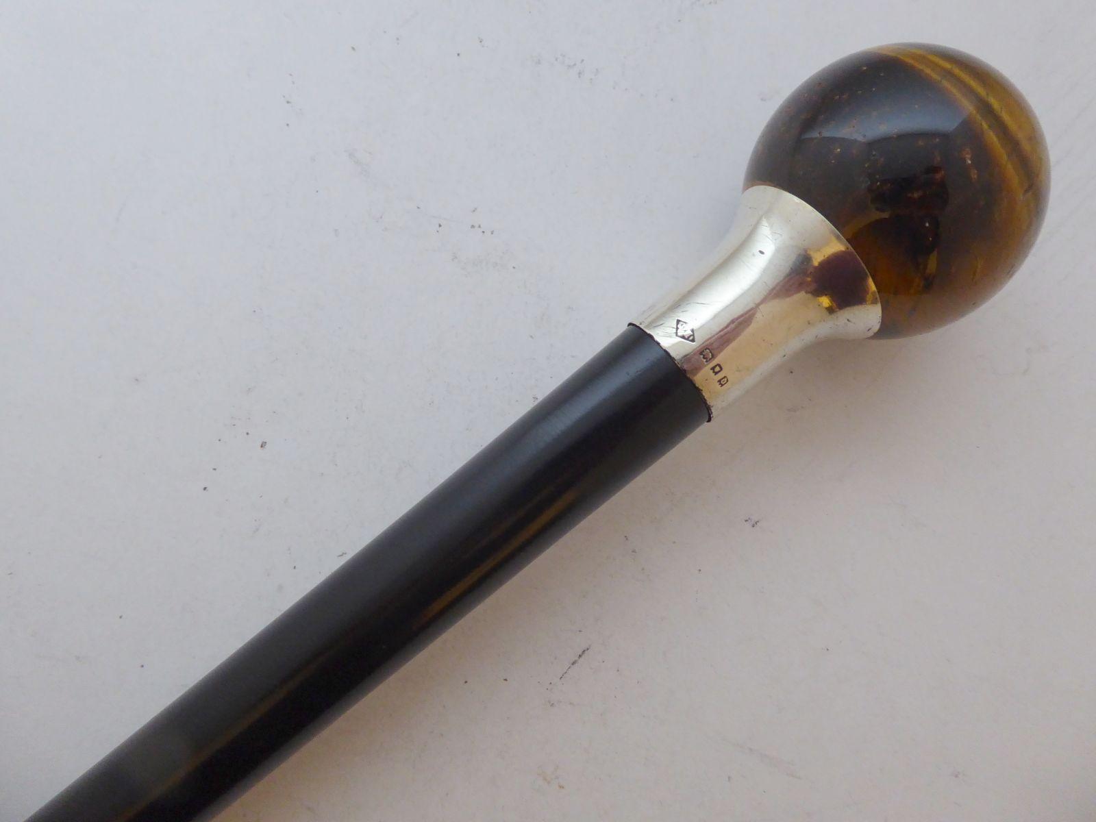 Walking Stick Cane 1919 Hallmarked Silver Collar Ebony Shaft Tigers Eye Top