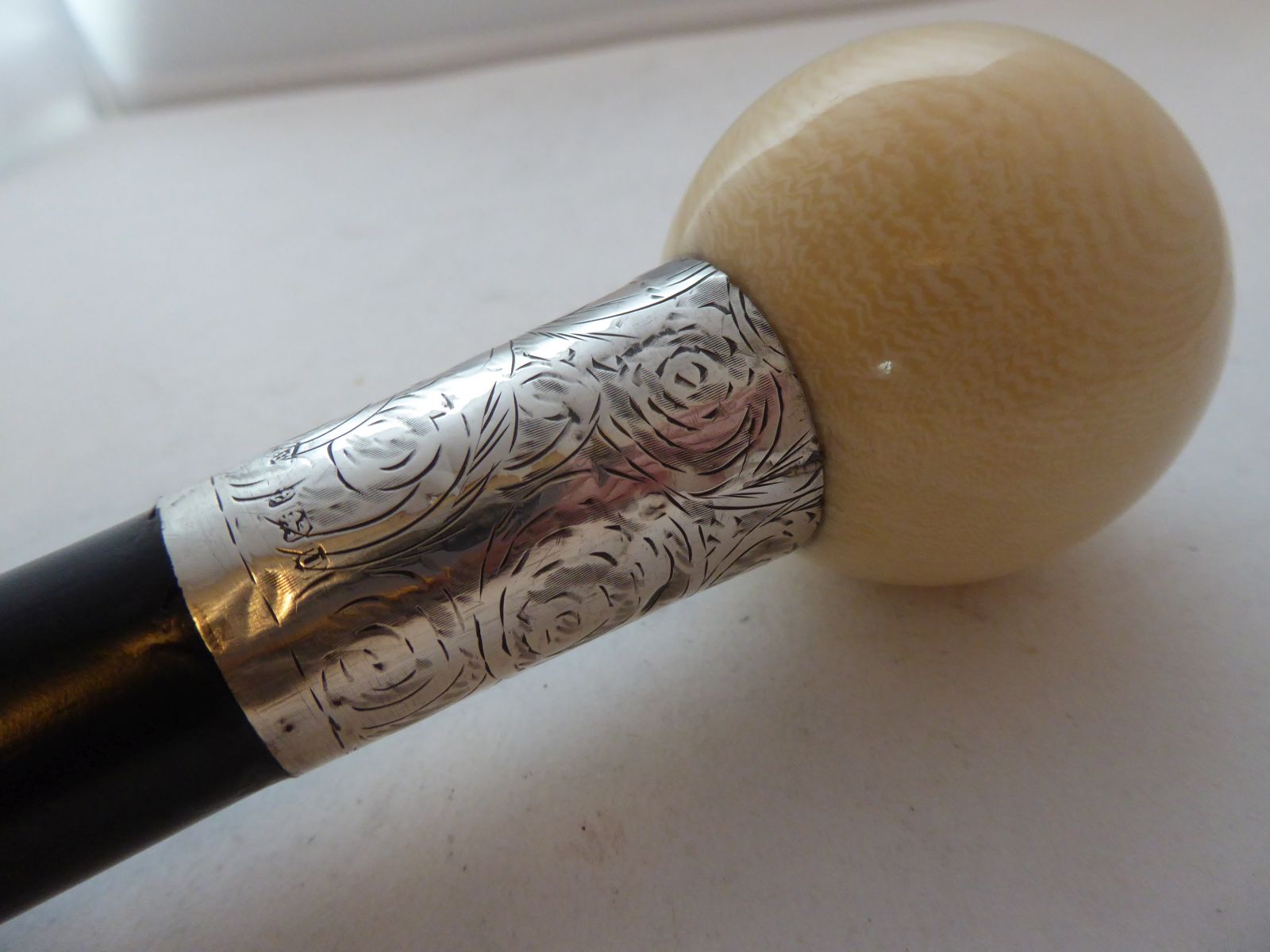Walking Stick Cane 1919 Solid Silver Collar Tagua Nut Pommel Ebony Wood Shaft