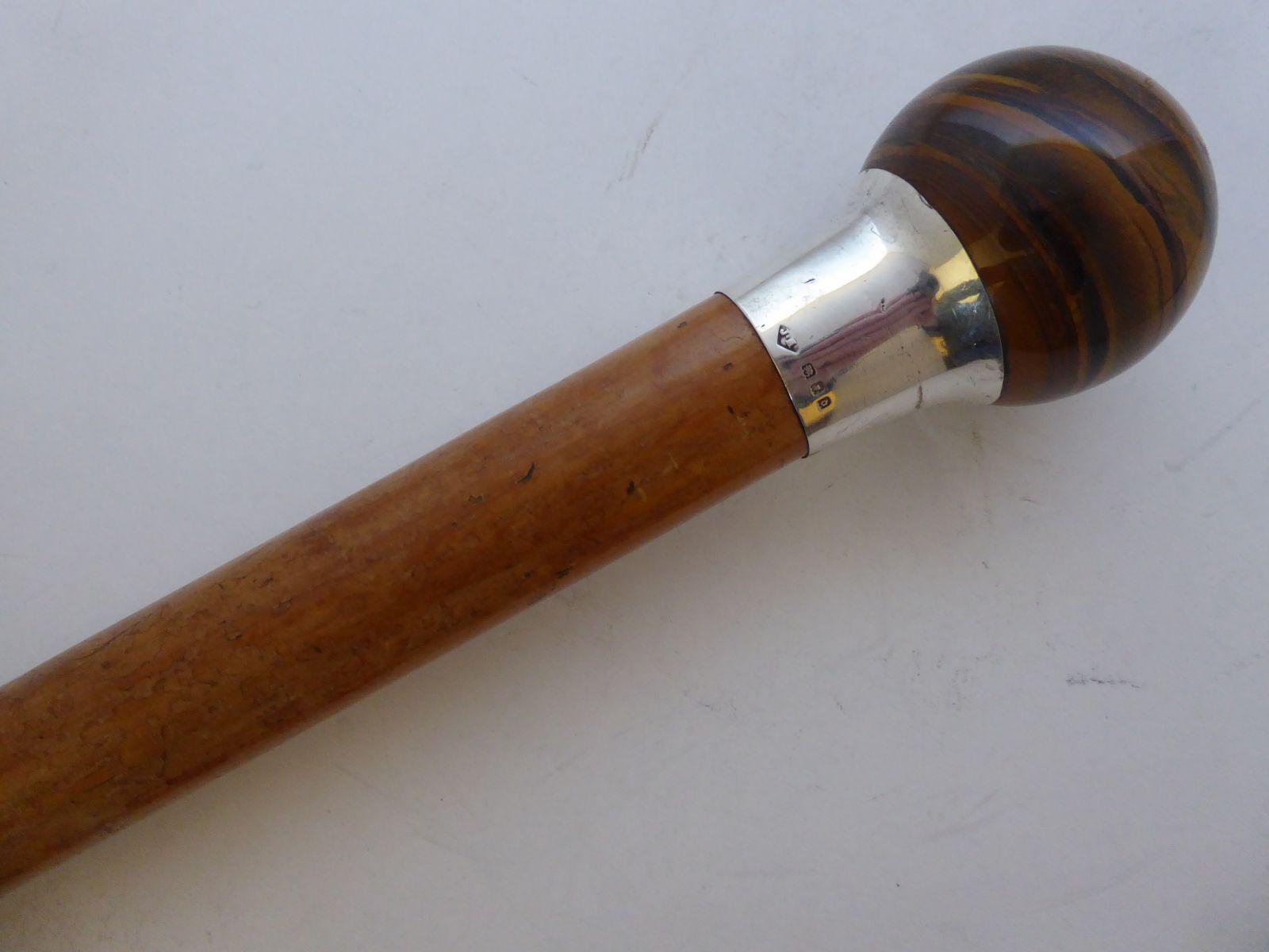 Walking Stick Cane 1919 Solid Silver Tigers Eye Pommel Malacca Shaft