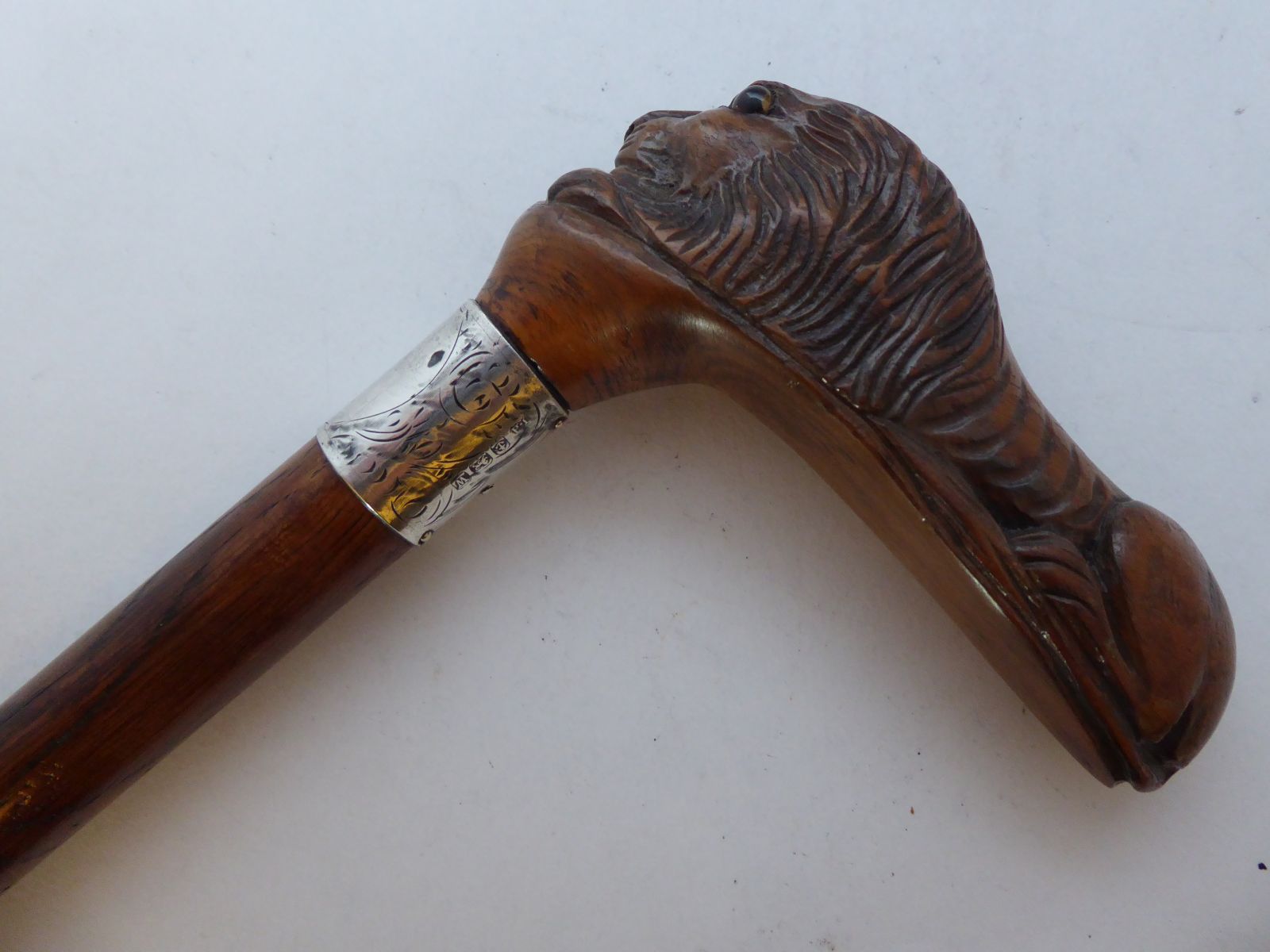 Walking Stick Cane 1921 Hallmarked Silver Collar Carved Lion Pommel Blackthorn Shaft