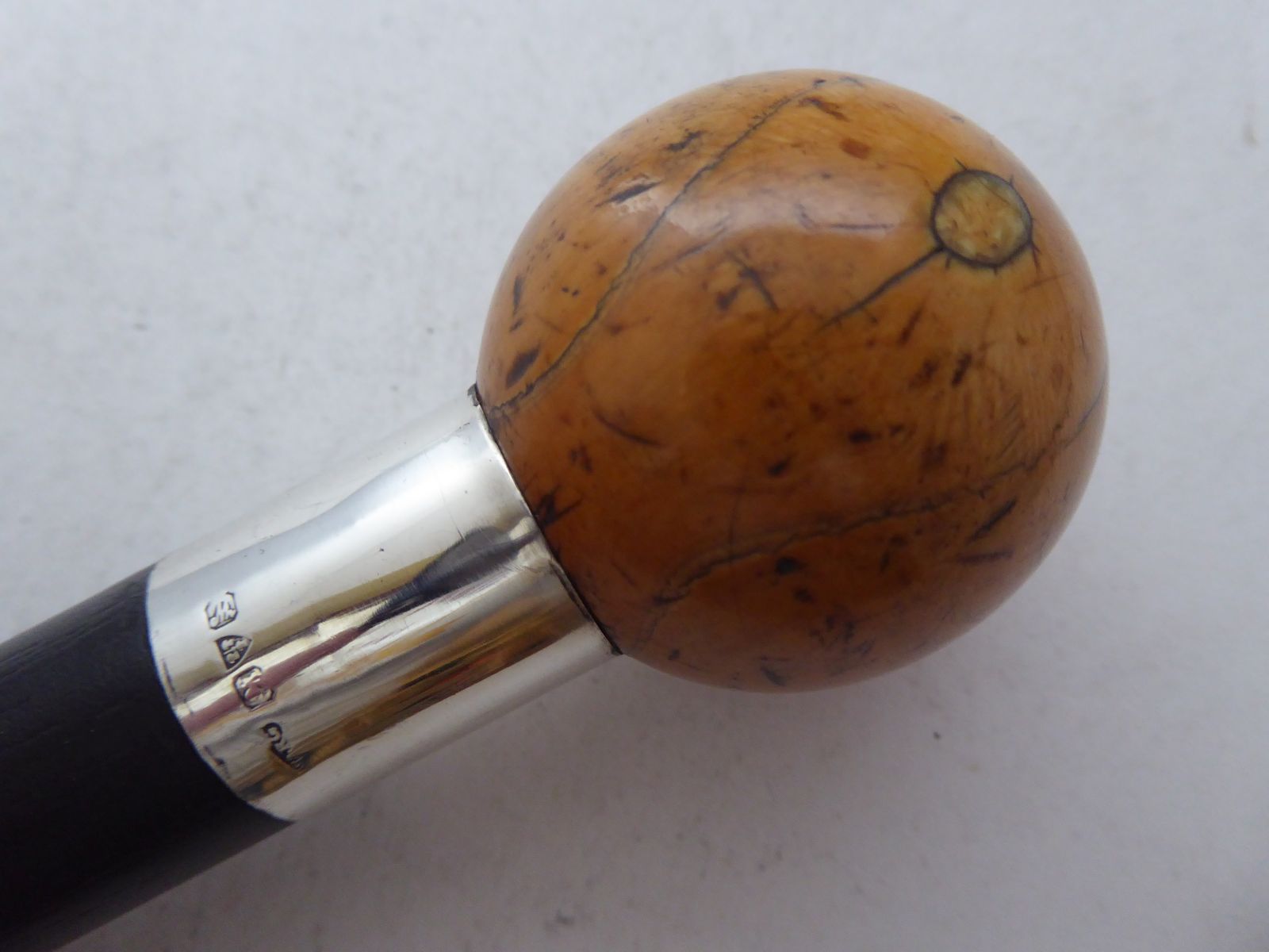 Walking Stick Cane 1922 Agate & Hallmarked Solid Silver Collar Ebony Wood Shaft