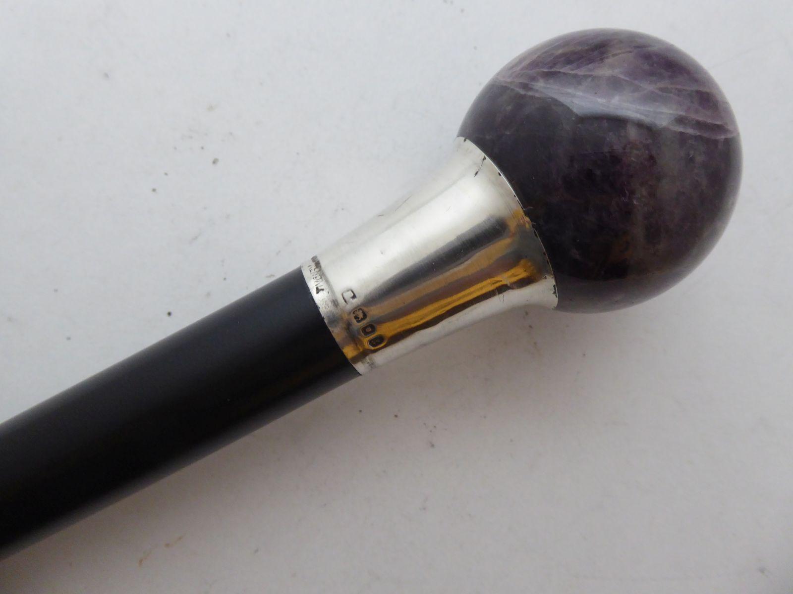 Walking Stick Cane 1922 Hallmarked Solid Silver Band Ebony Shaft Amethyst Top