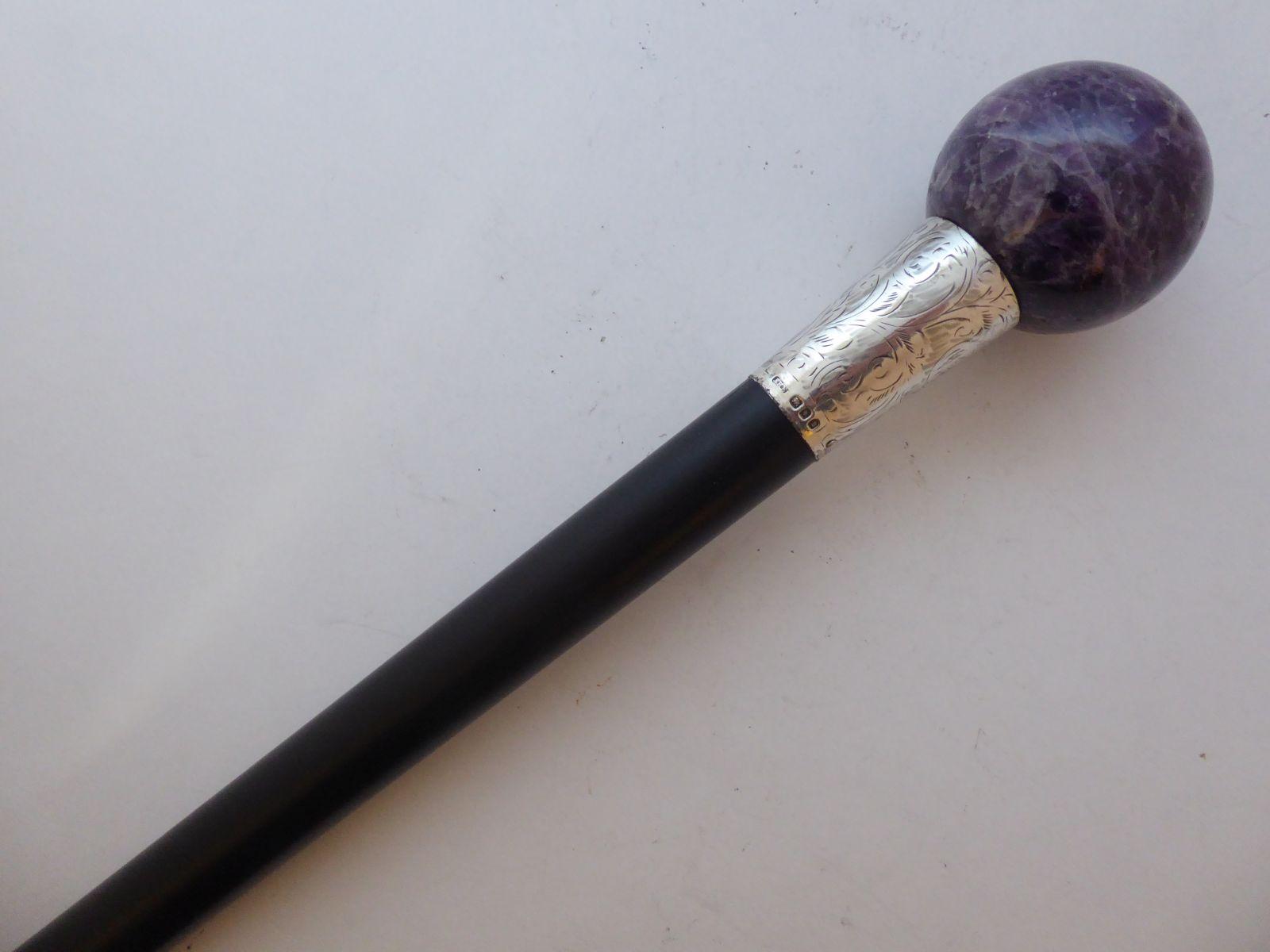 Walking Stick Cane 1922 Hallmarked Solid Silver Collar Ebony Shaft Amethyst Top