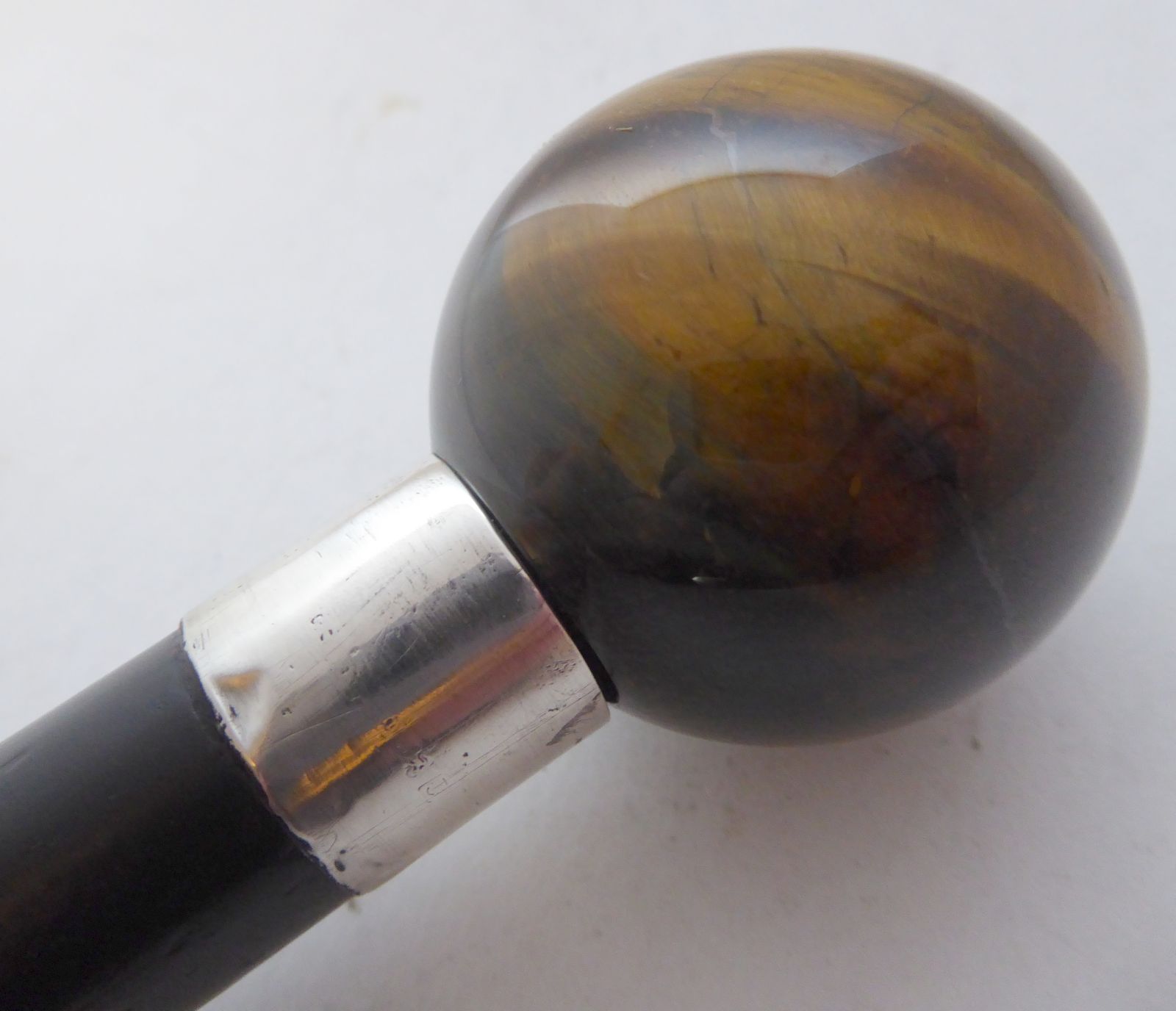 Walking Stick Cane 1923 Hallmarked Solid Silver Collar Tigers Eye Pommel Ebony