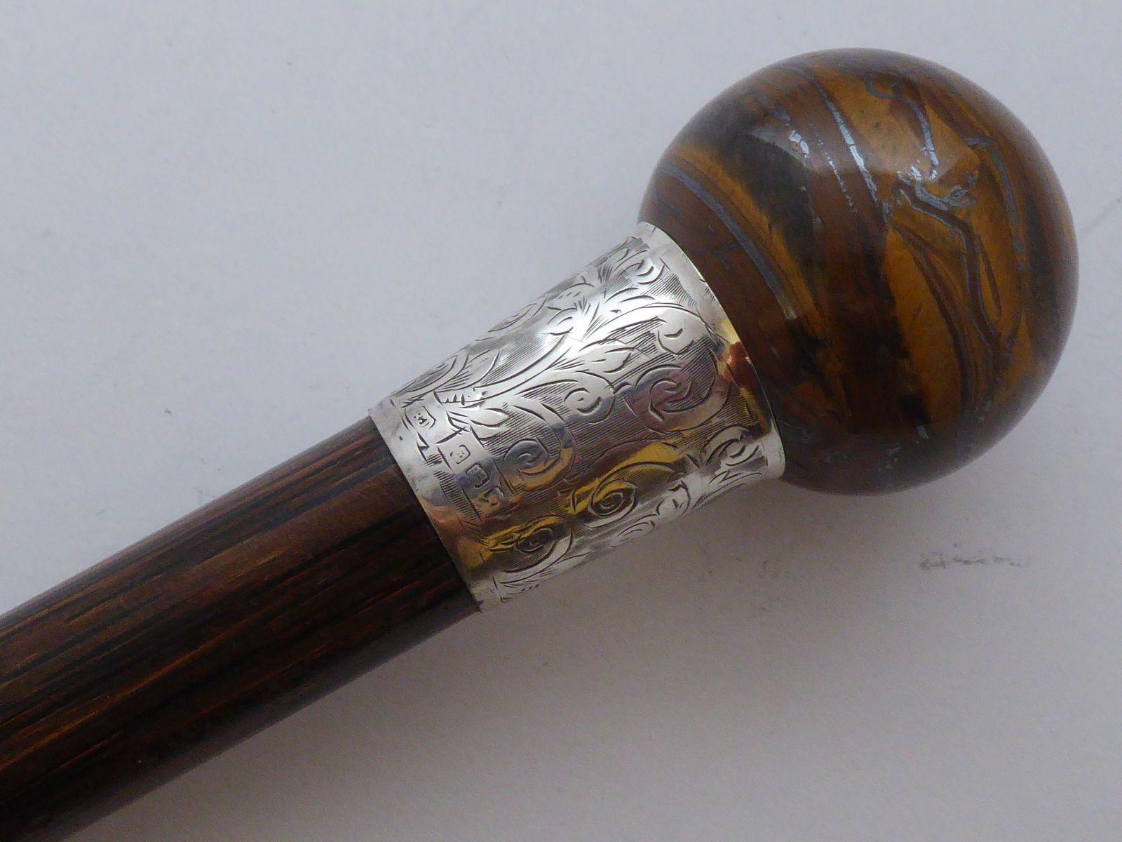 Walking Stick Cane 1924 Hallmarked Silver Collar Tigers Eye Coconut Palm Shaft