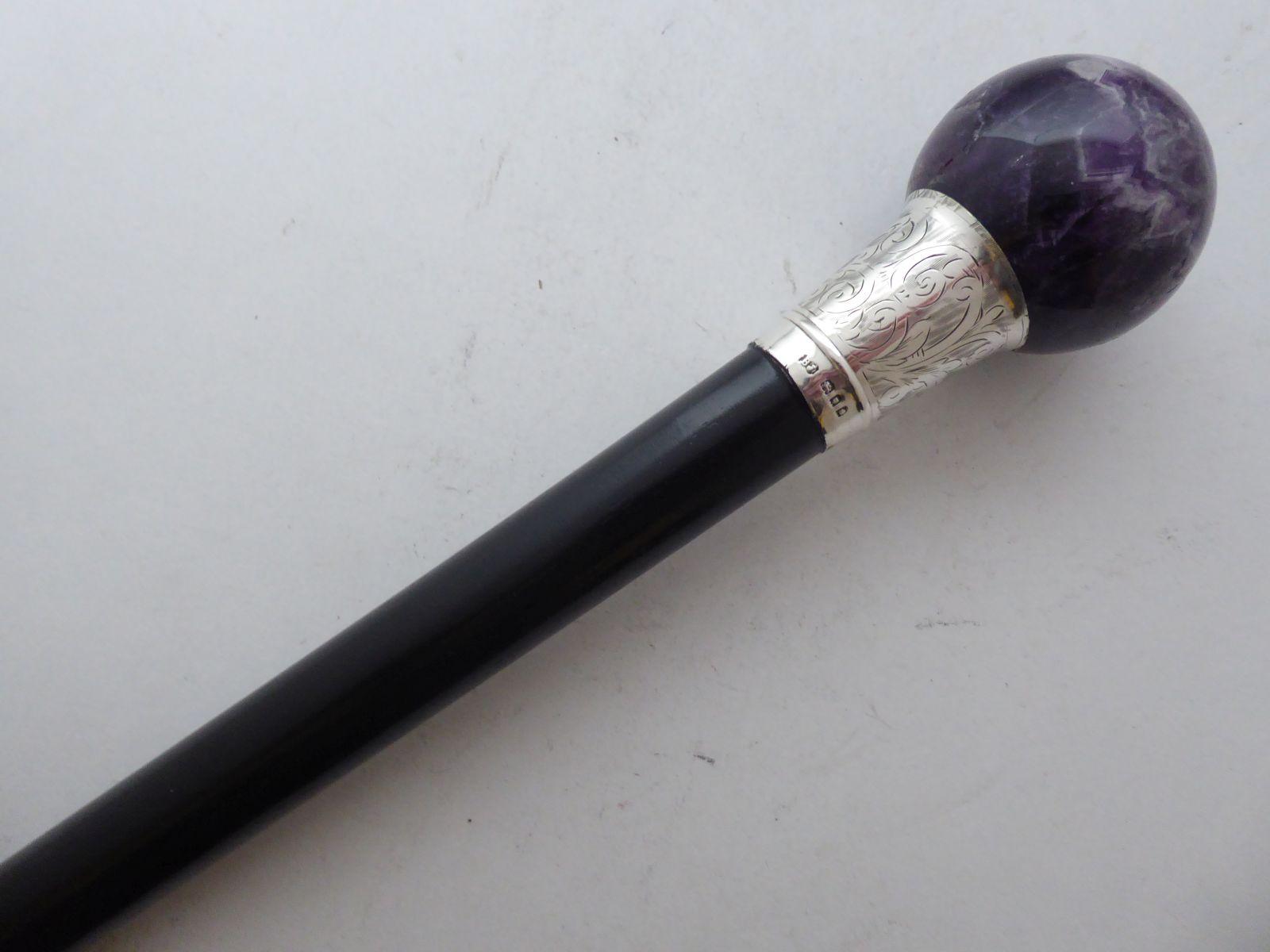 Walking Stick Cane 1924 Hallmarked Solid Silver Collar Ebony Shaft Amethyst Top