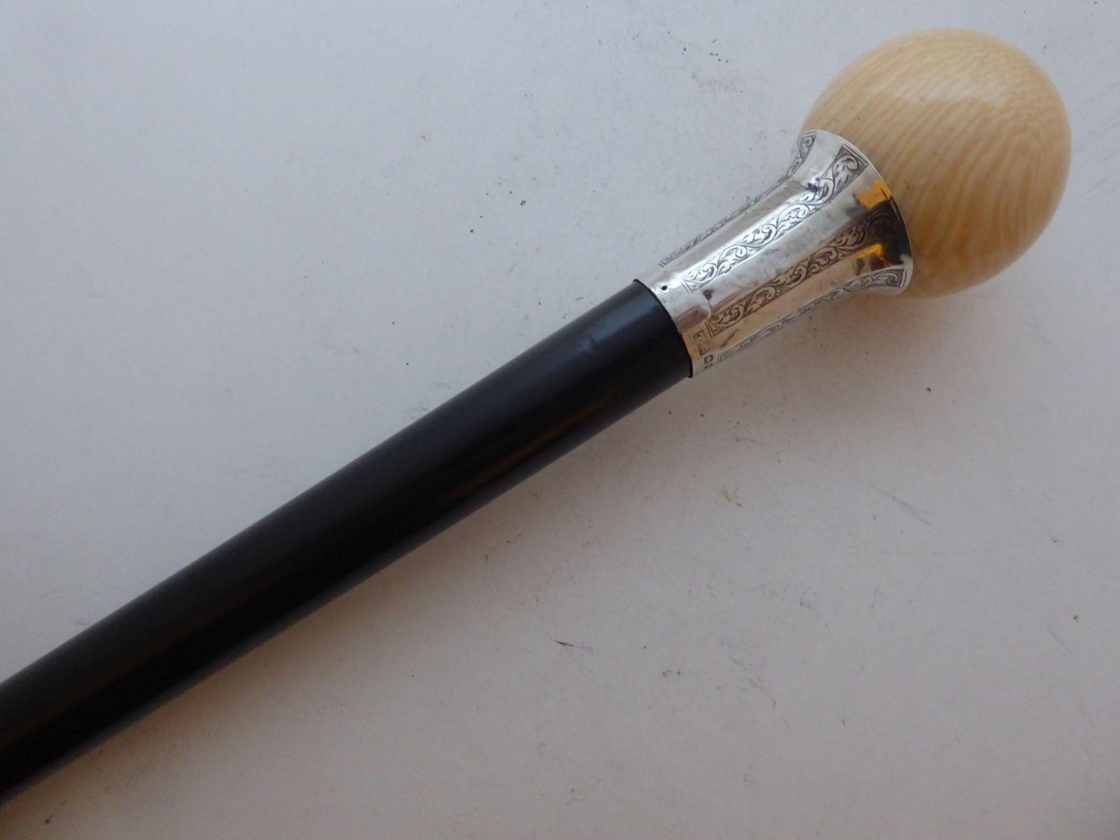 Walking Stick Cane 1926 Hallmarked Silver Collar Ebony Wood Shaft Tagua Nut Top