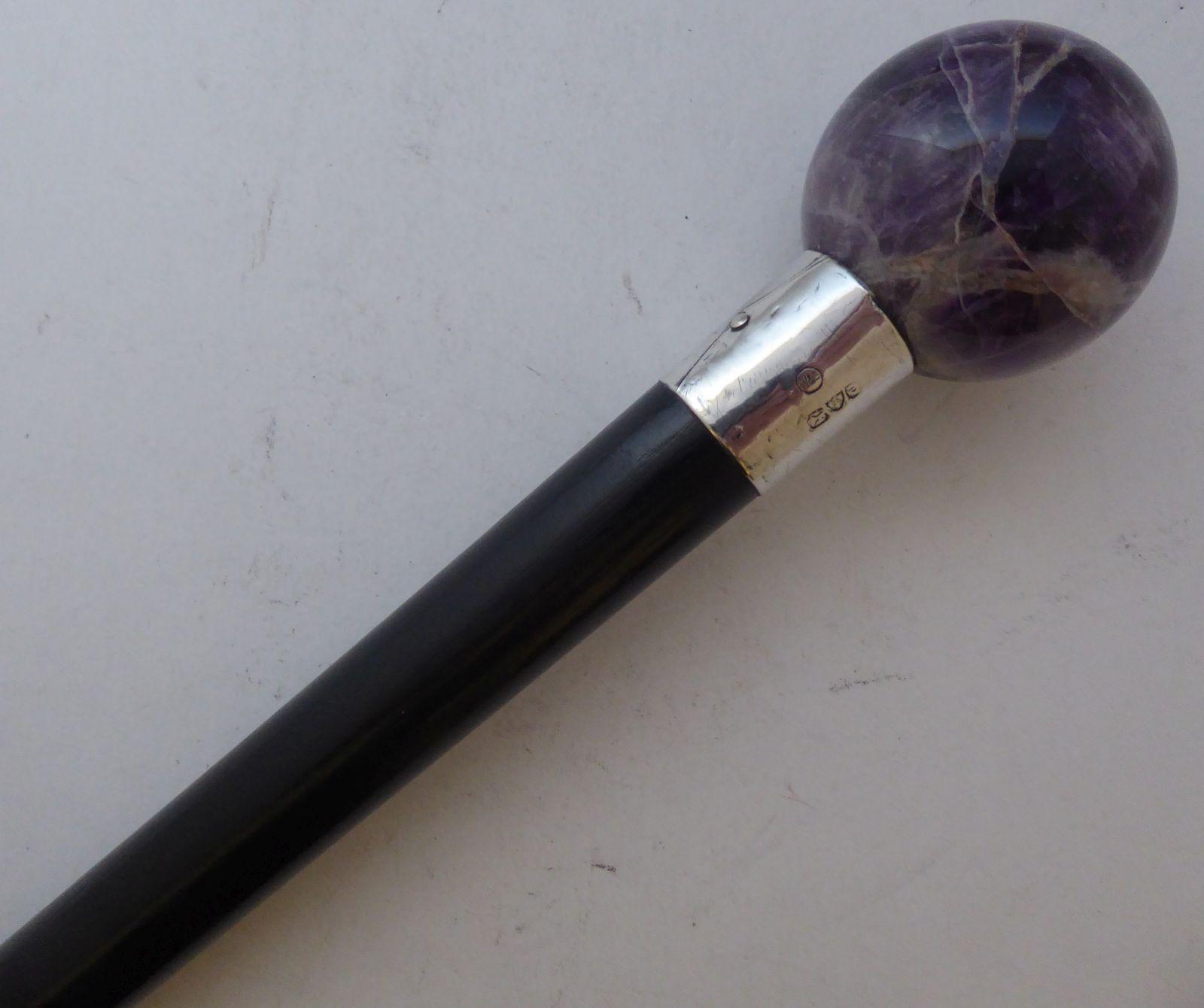 Walking Stick Cane 1926 Hallmarked Solid Silver Collar Ebony Shaft Amethyst Pommel