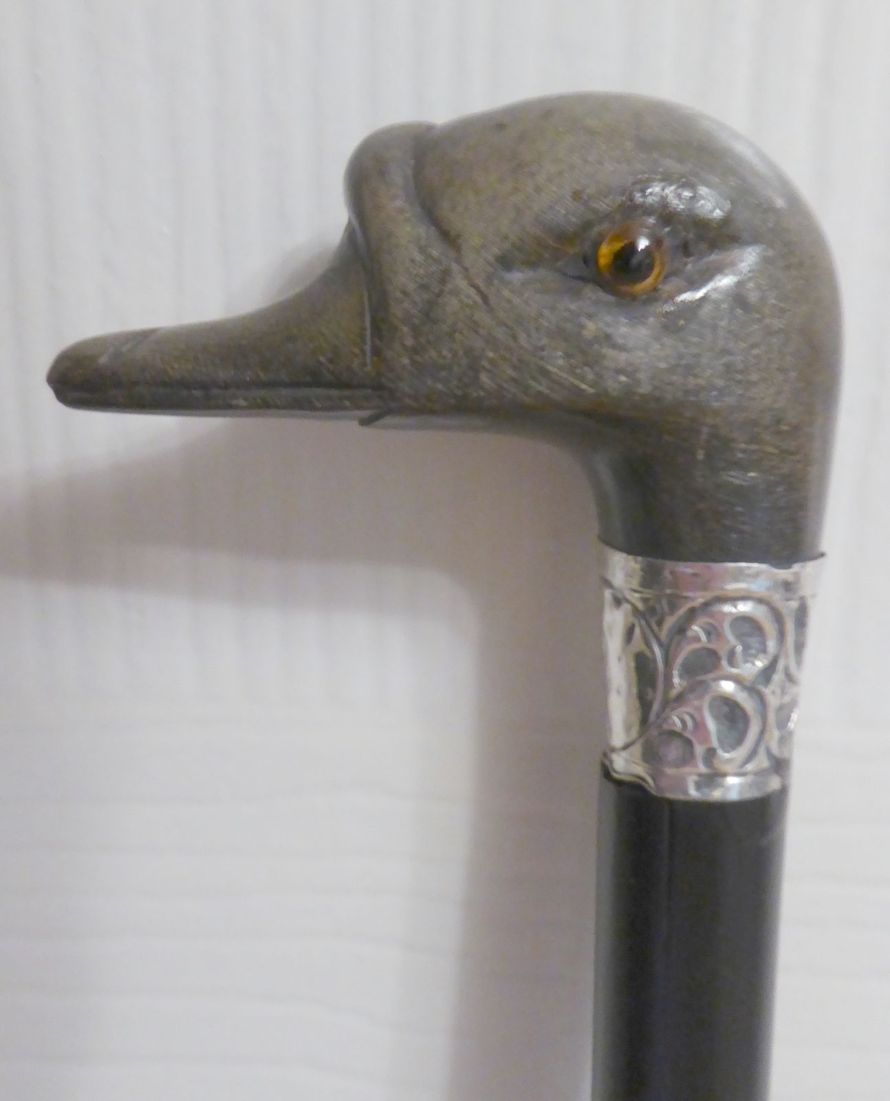 Walking Stick Cane Duck Head Hallmarked Solid Silver Pommel Ebonised Wood Shaft