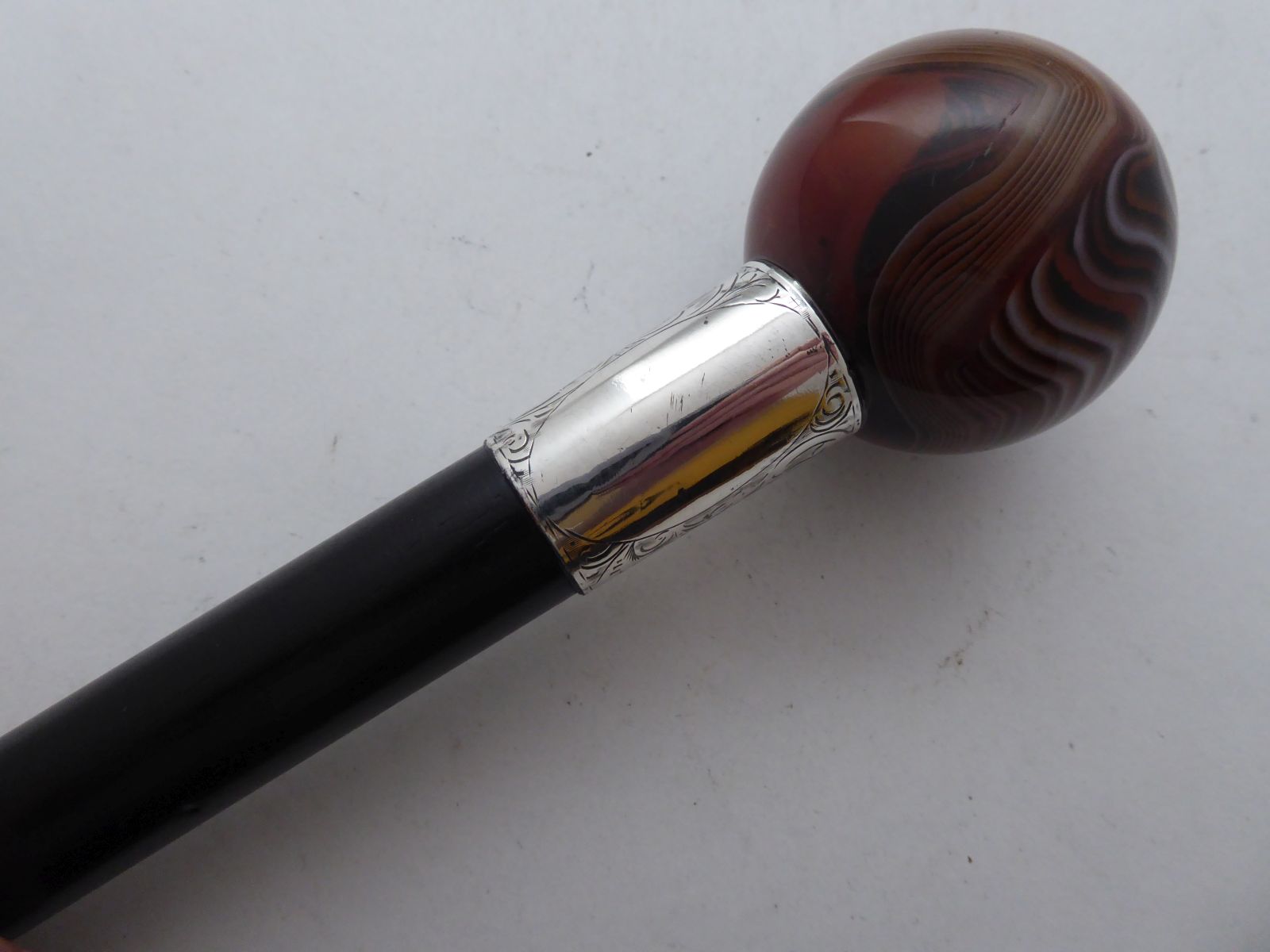 Walking Stick Cane Hallmarked Solid Silver Collar Agate Pommel Ebony Wood Shaft