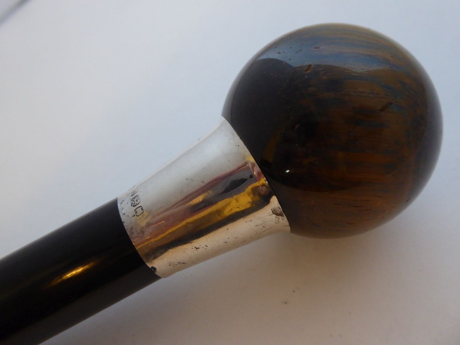 Walking Stick Cane Hallmarked Solid Silver Collar Tigers Eye Ebony Wood Shaft