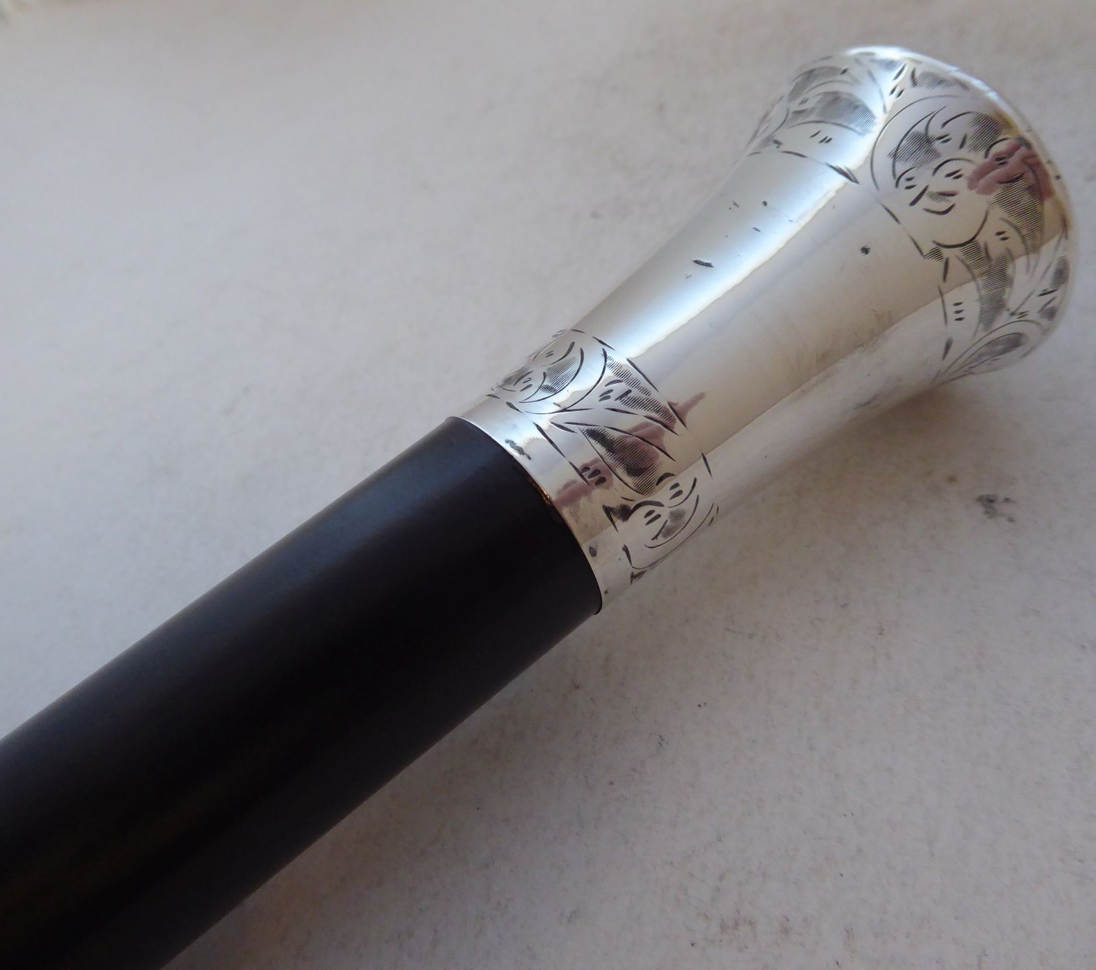 Walking Stick Cane Hallmarked Solid Silver Pommel Ebonised Wood Shaft c.1900