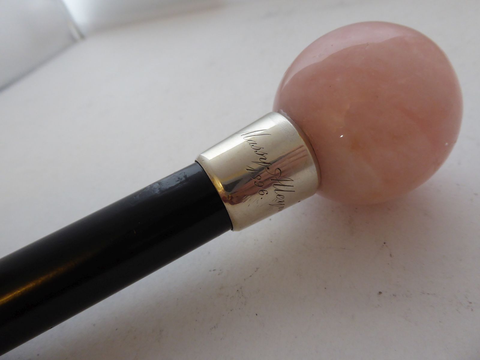 Walking Stick Cane Hallmarked Solid Silver Rose Quartz Pommel Ebony Wood Shaft