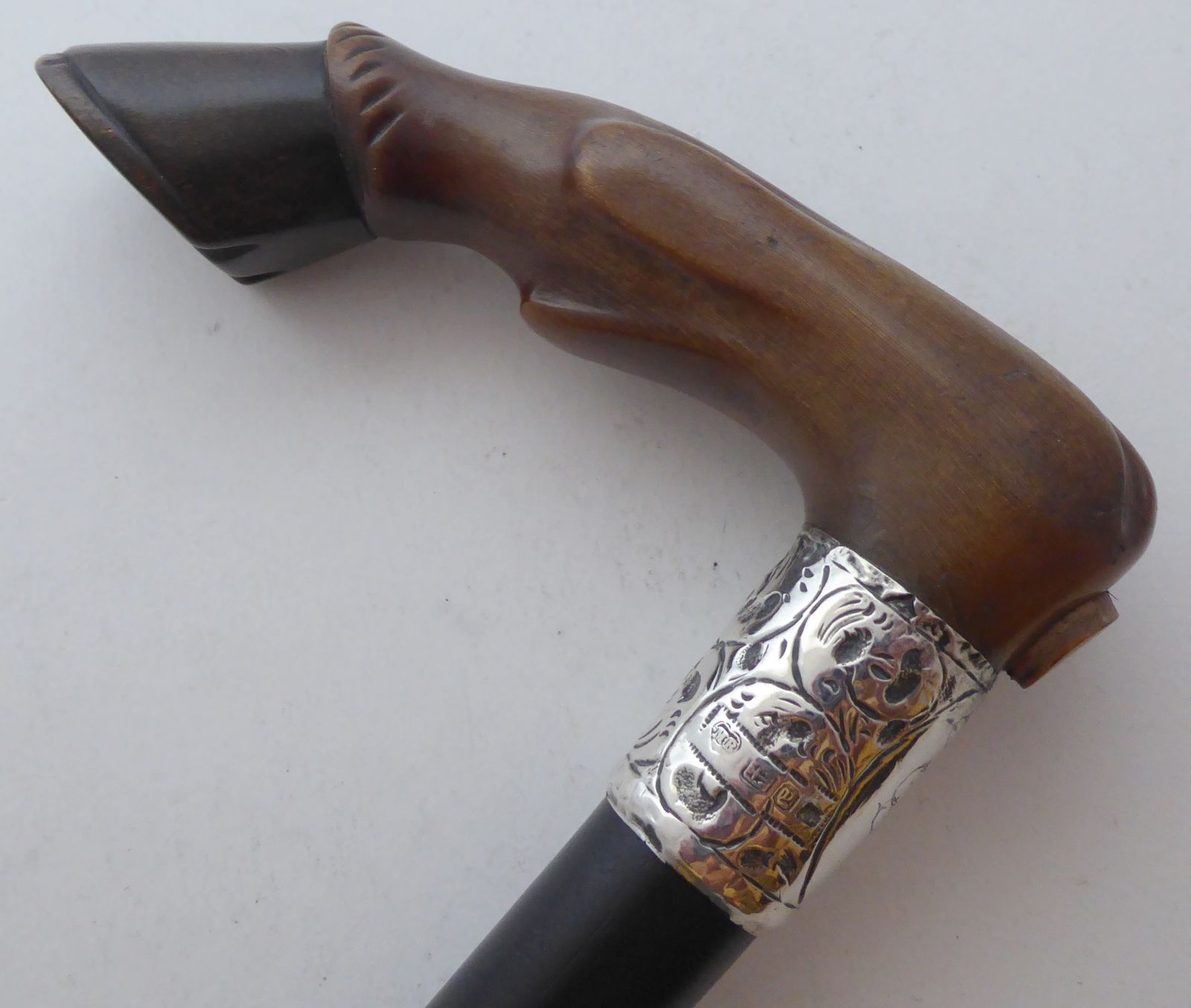 Walking Stick Cane Horse Shoe 1898 Solid Silver Collar Ebony Wood Shaft