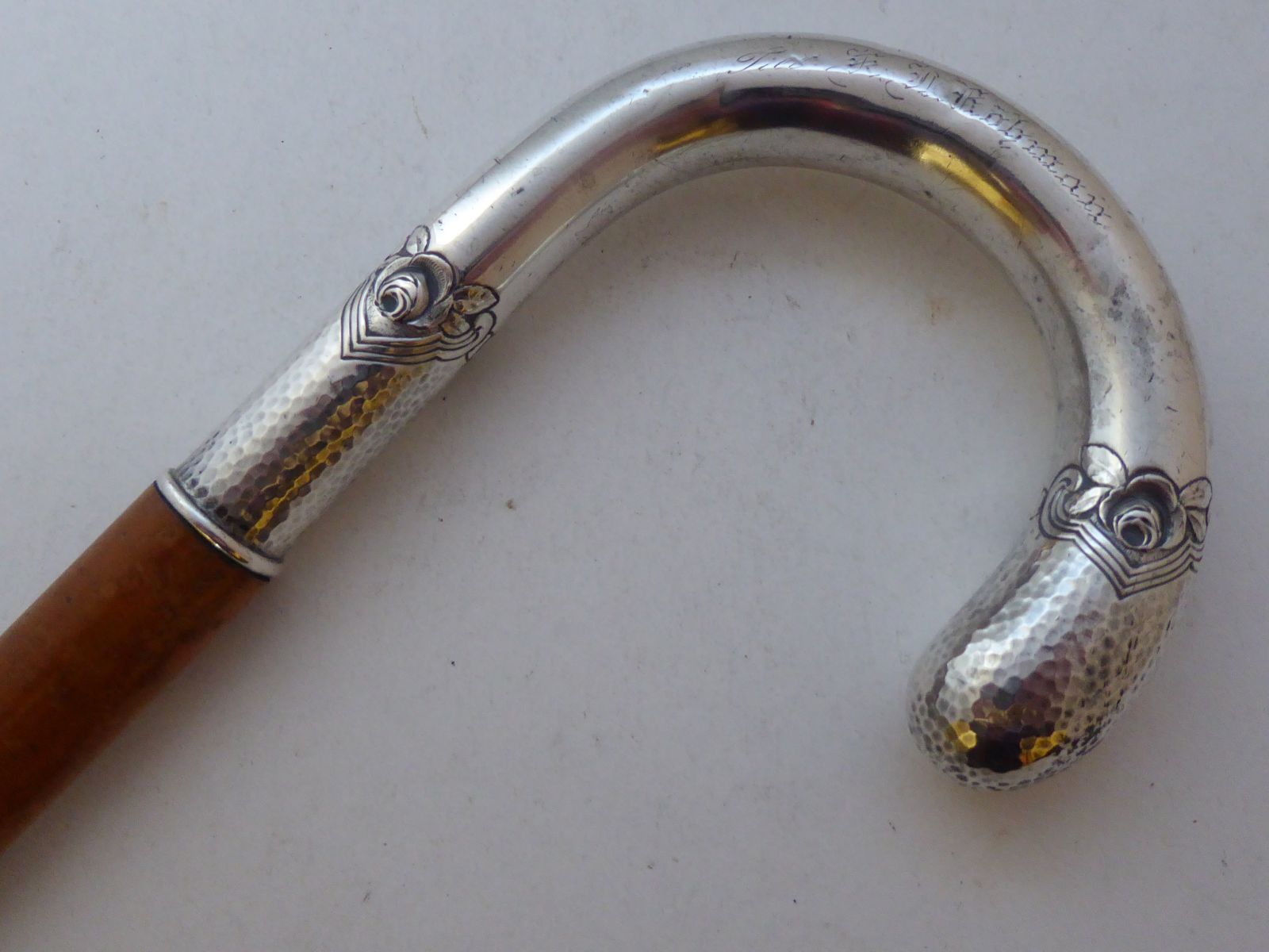 Walking Stick Cane Solid Silver Handle Malacca Wood Shaft Art Nouveau Design c.1930