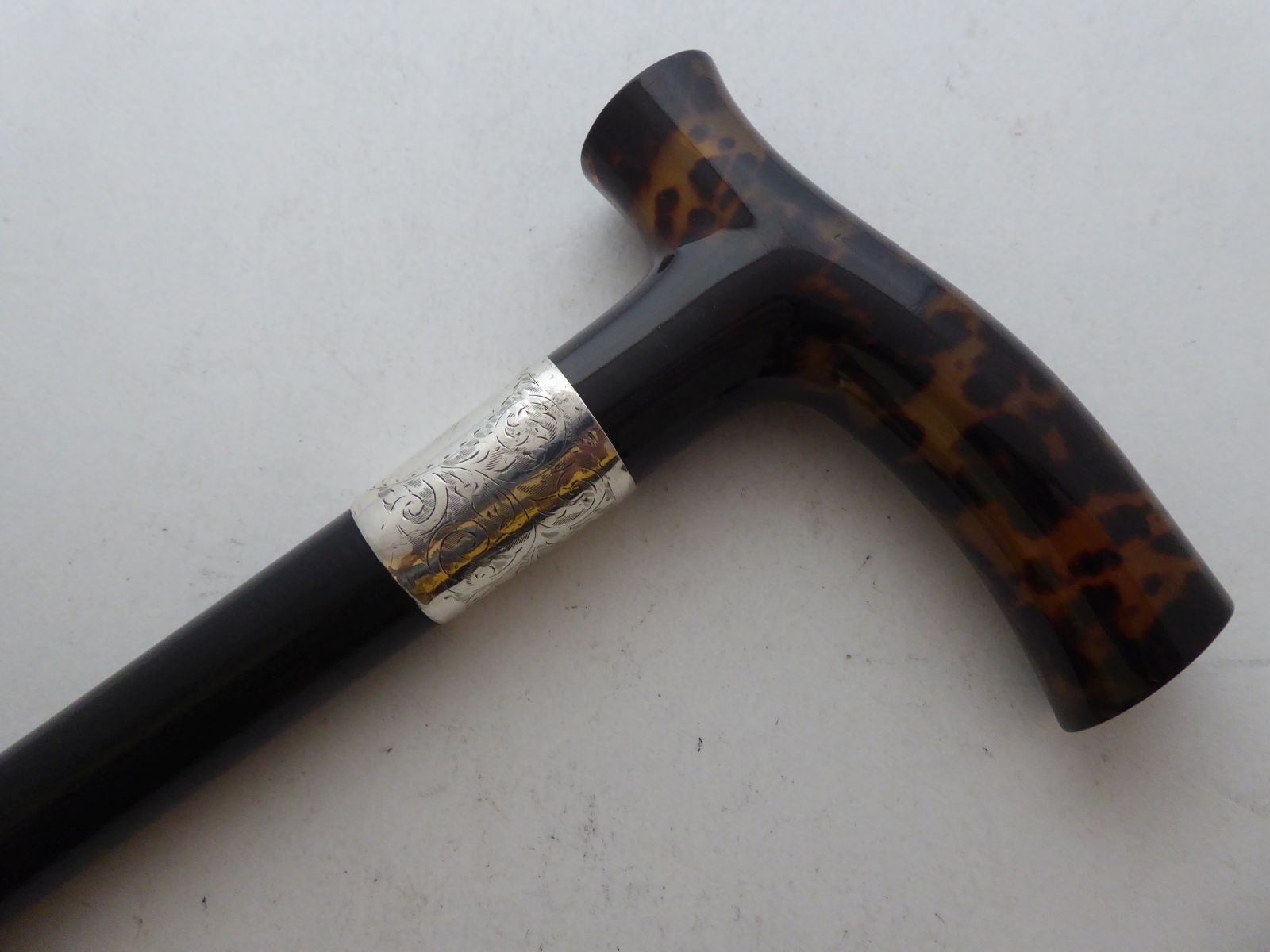 Walking Stick Cane Tortoise Shell Tortoiseshell Handle 1913 Silver Collar Ebony Shaft