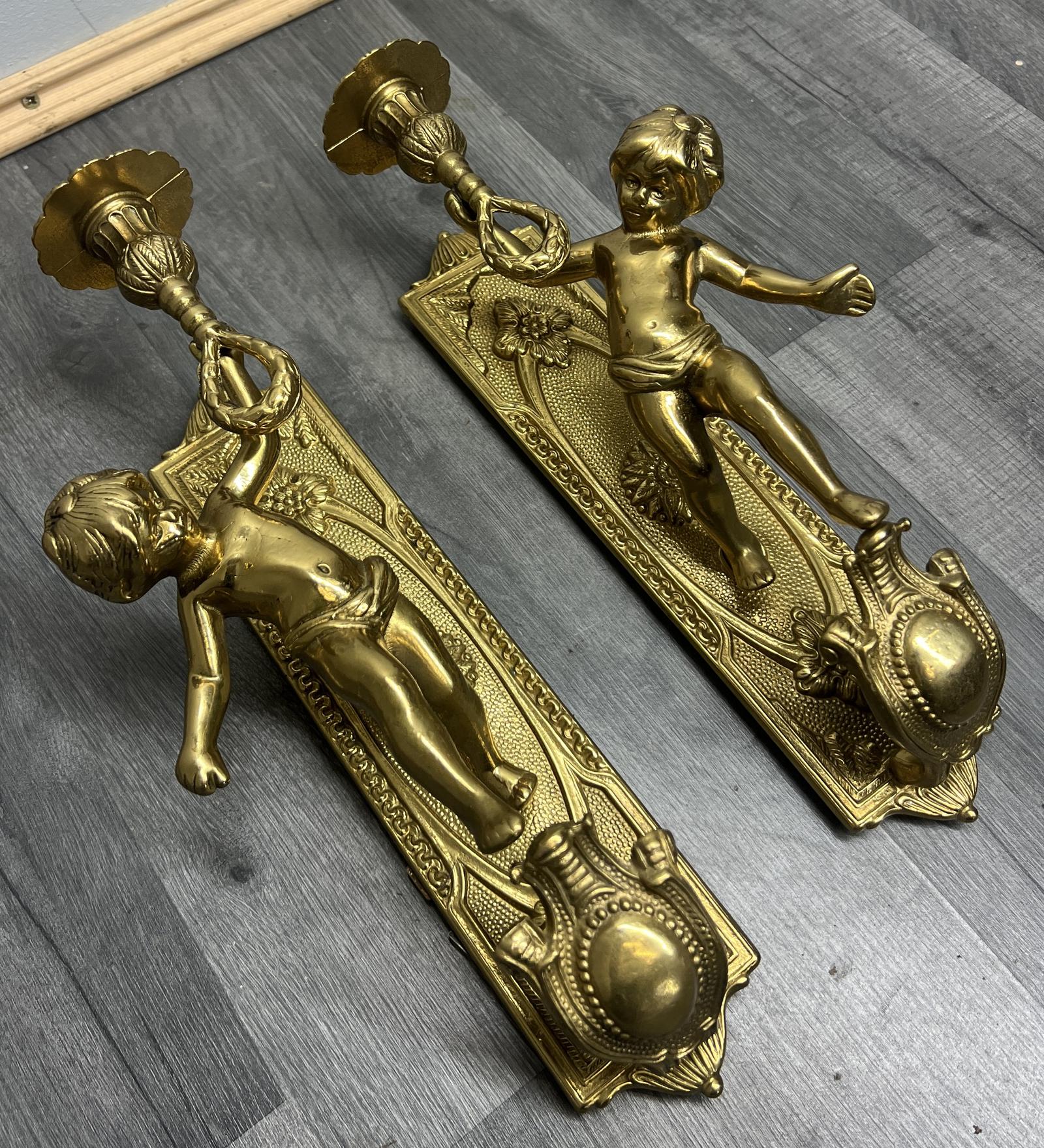 Wall Candle Holder Vintage French Style Sconce Pair Brass Cherub