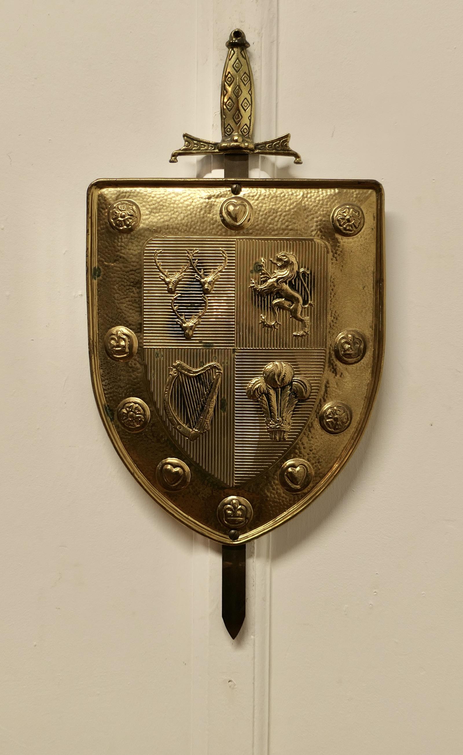 Wall Hanging Arts & Crafts Brass Shield with Sword