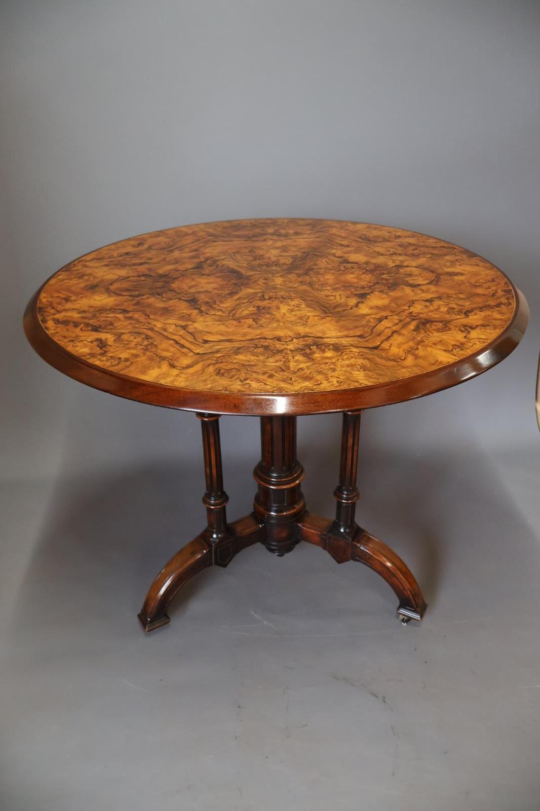 Walnut aesthetic movement centre/occasional table, highly figured walnut table top, over a central turned and fluted column, tripod base, flanked by three matching supporting columns, out-swept legs, terminating with original brass castors. This table has been restored in our workshop and is in home ready condition.