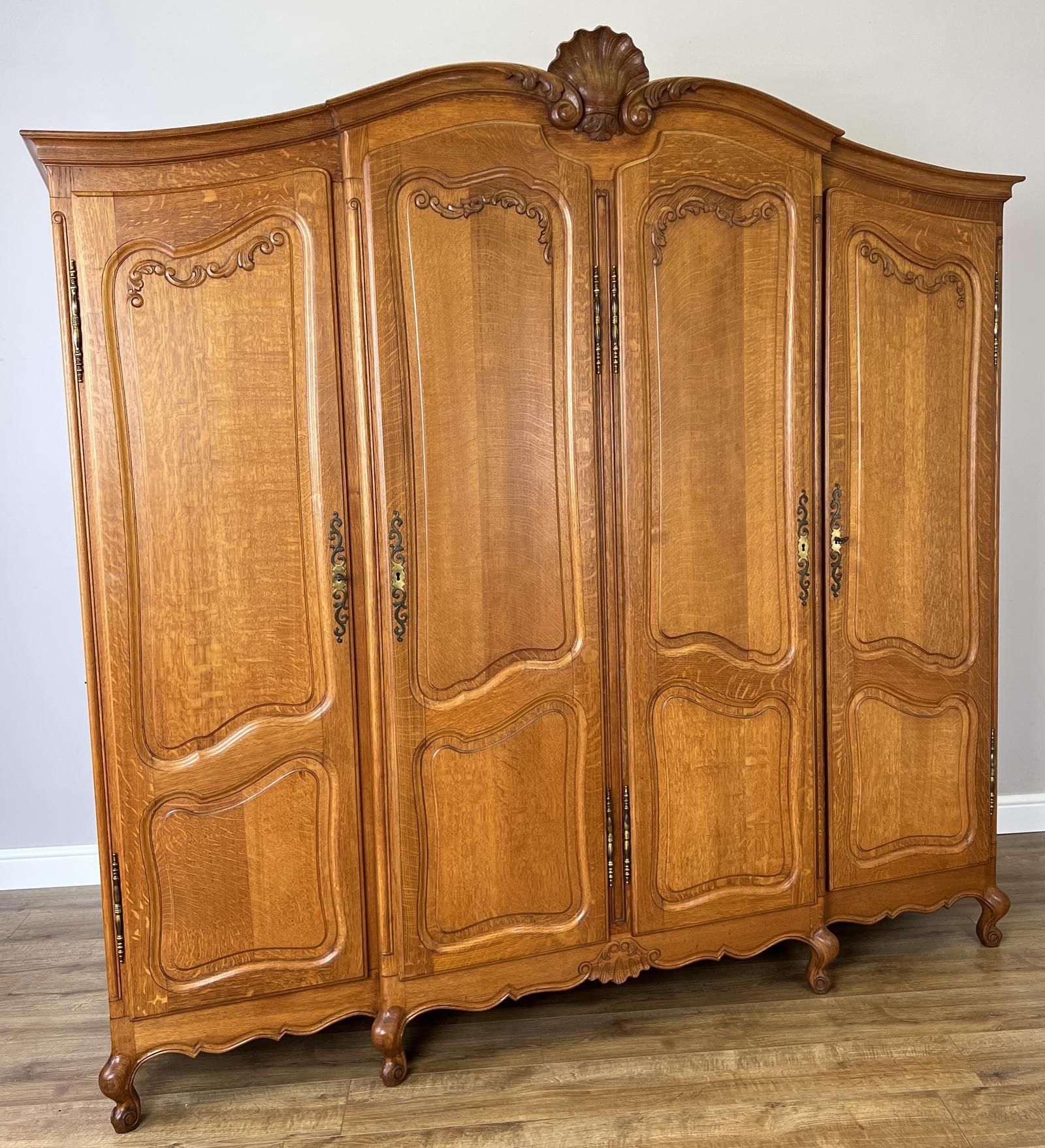 This striking wardrobe features a beautifully finished oak wood case with rich grain patterns and classic French Louis styling. The four doors are decorated with elegant moulded panels and subtle carved details, complemented by decorative handles. The shaped base and curved feet enhance the refined silhouette, while the arched top with carved shell crest adds a distinctive decorative focal point.