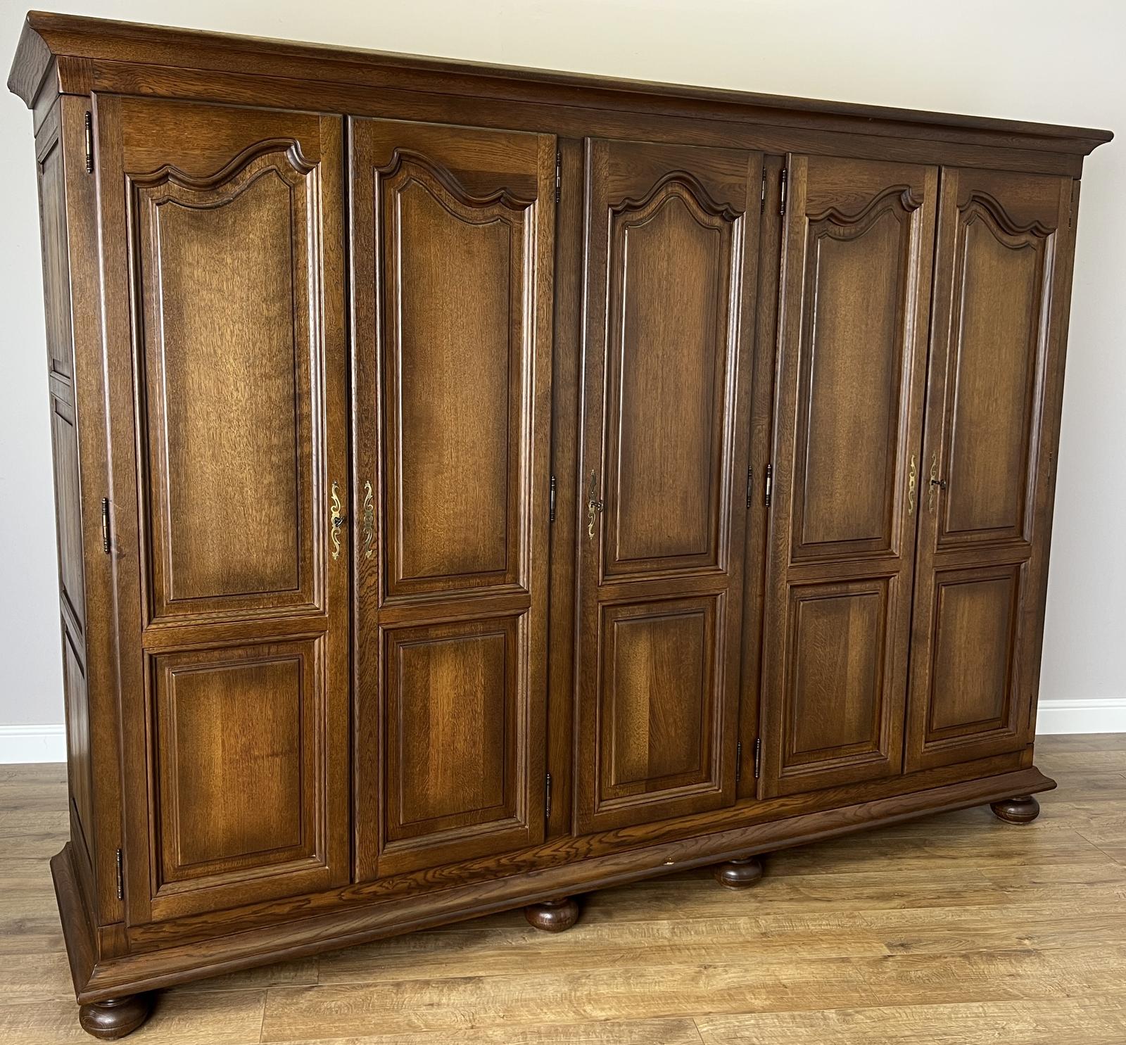 Crafted from oak, this wardrobe showcases classic French styling with shaped panelled doors, subtle carved detailing, and a beautifully grained finish. The symmetrical six-door layout enhances its grand presence, while the solid base and traditional form reflect quality craftsmanship and durability.