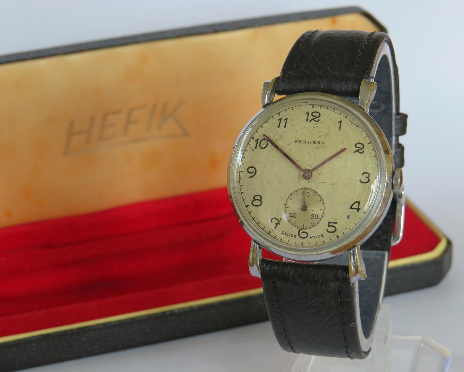 The watch has a 17-jewel hand-winding movement, signed Hefik Watch Co Ltd, which is working nicely.