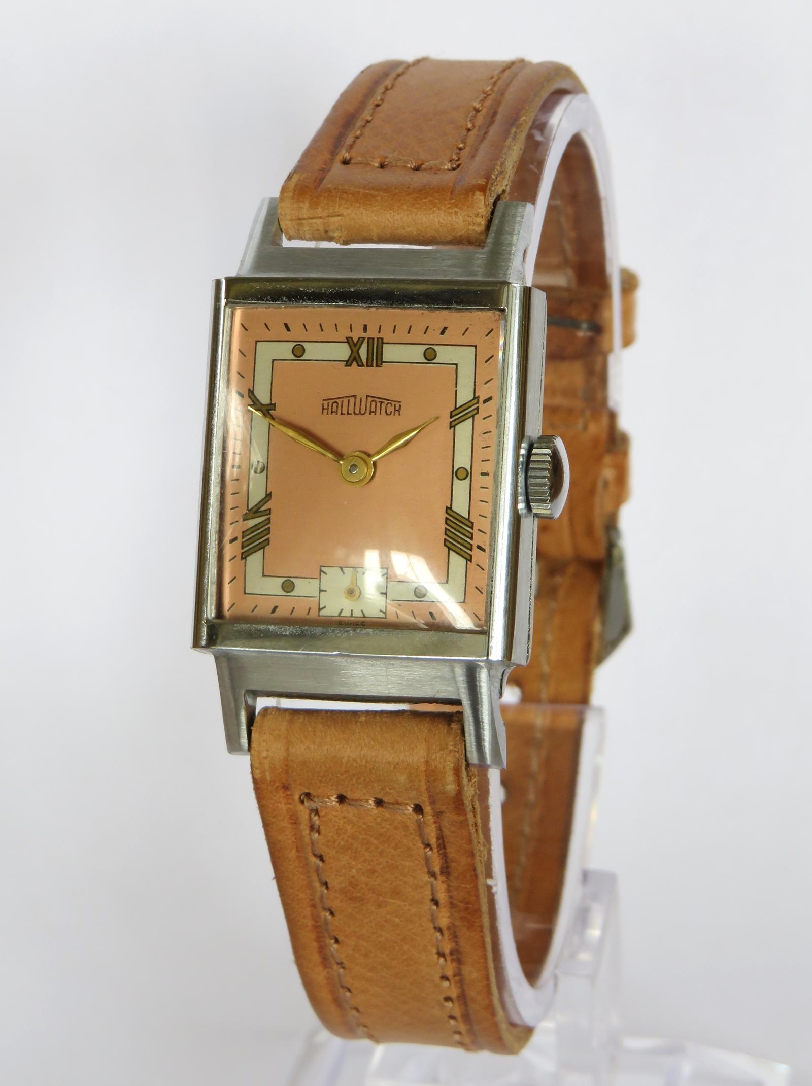 The dial is signed HallWatch which we believe to be a brand name. It is in its original copper coloured two tone finish with original hands, all in really super condition.