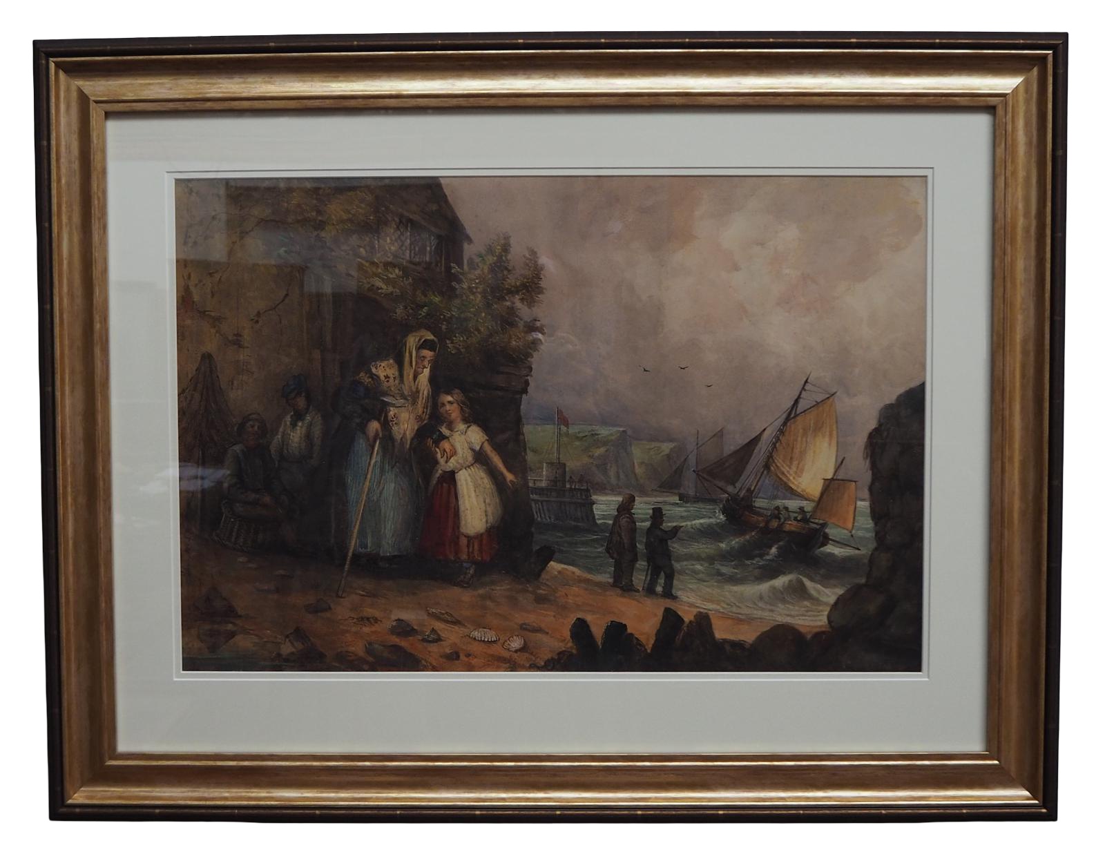 Watercolour of harbour and ship scene by Scottish artist James Campbell Noble RSA (1896-1913). Delightful and fine watercolour of Scottish harbour and ship scene with granny and little girl in foreground.