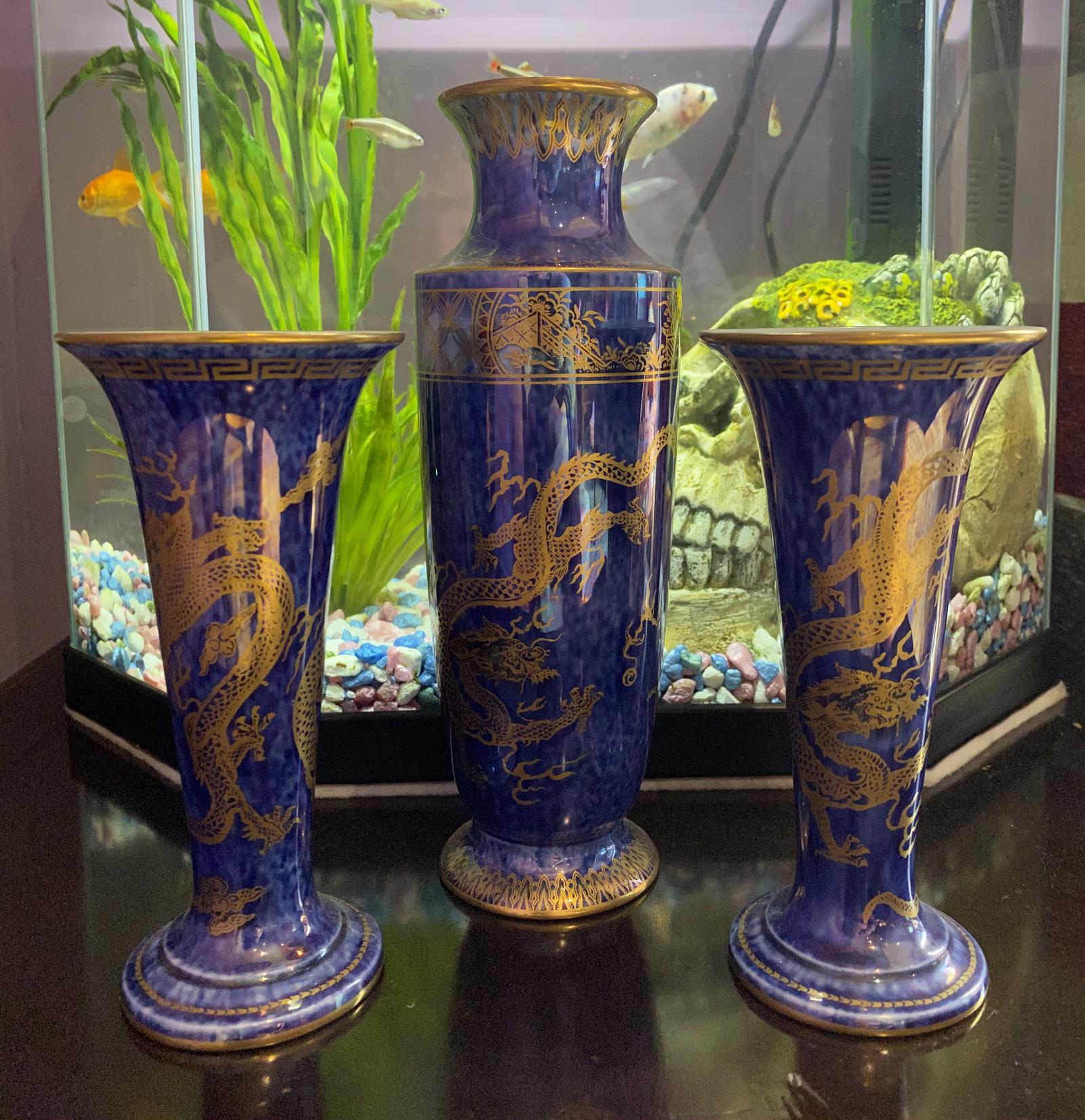 Wedgwood Lustre garniture of 3 Vases decorated with Dragon design by Daisy Makeig-Jones