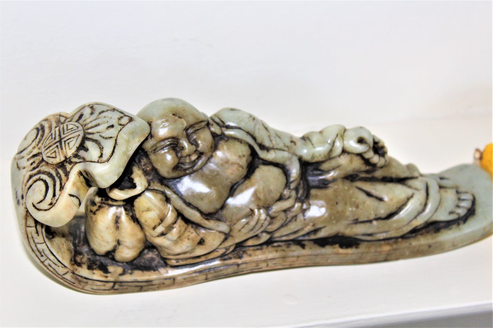 Well Carved Large Chinese Soapstone Desk Seal Depicting a Buddha Reclining on a Rui Sceptre c.1880