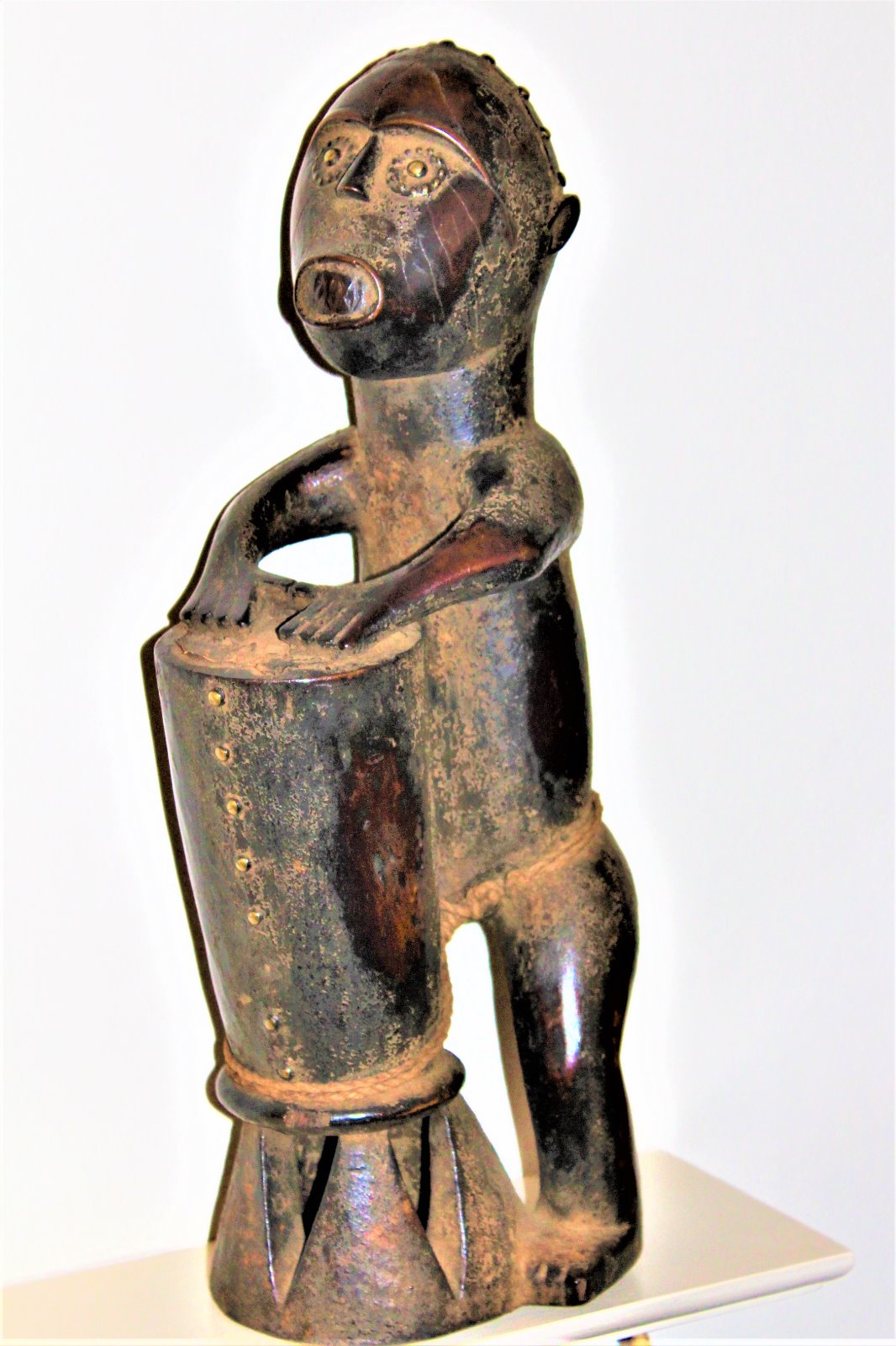 Well Carved Wood African Tribal Figure of a Man Beating a Drum Possibly by the Kongo of West Central Africa