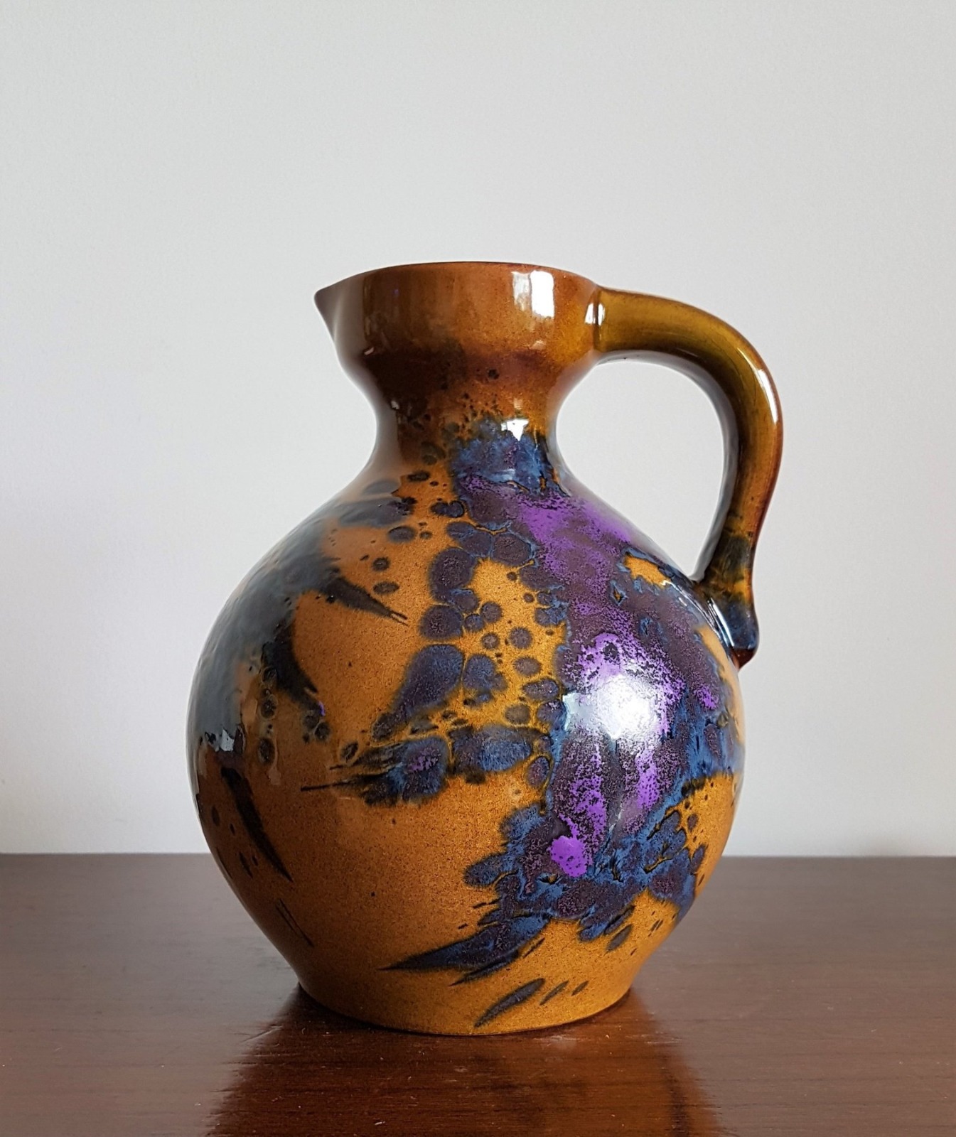 West German Marei Keramik Mustard, Indigo & Purple 'Brasil' Glaze Ceramic Flagon Jug Vase