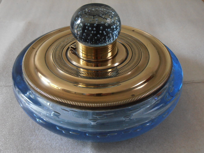 Whitefriars Blue Glass Brass Inkwell c.1920 (1 of 1)