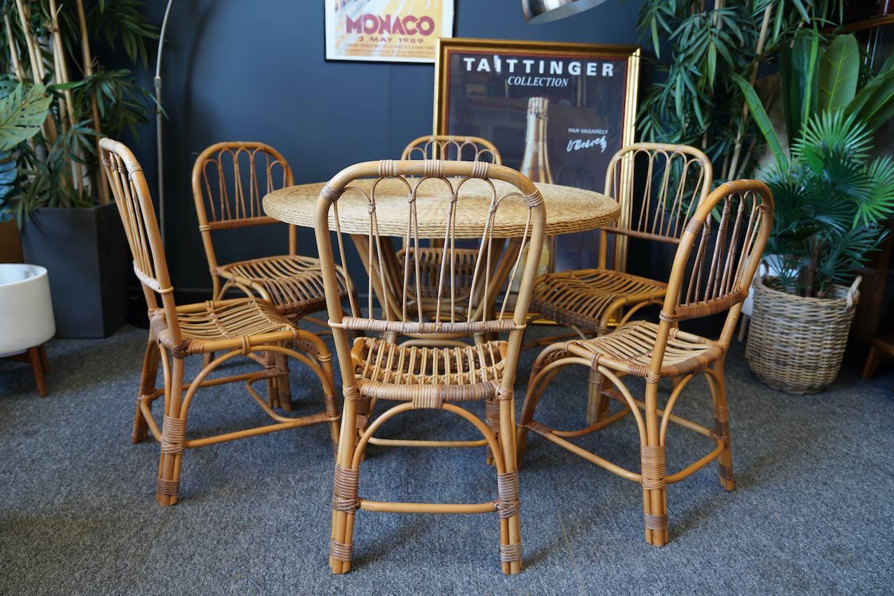 Wicker Dining Table 6 Peacock Style Chairs 1970s
