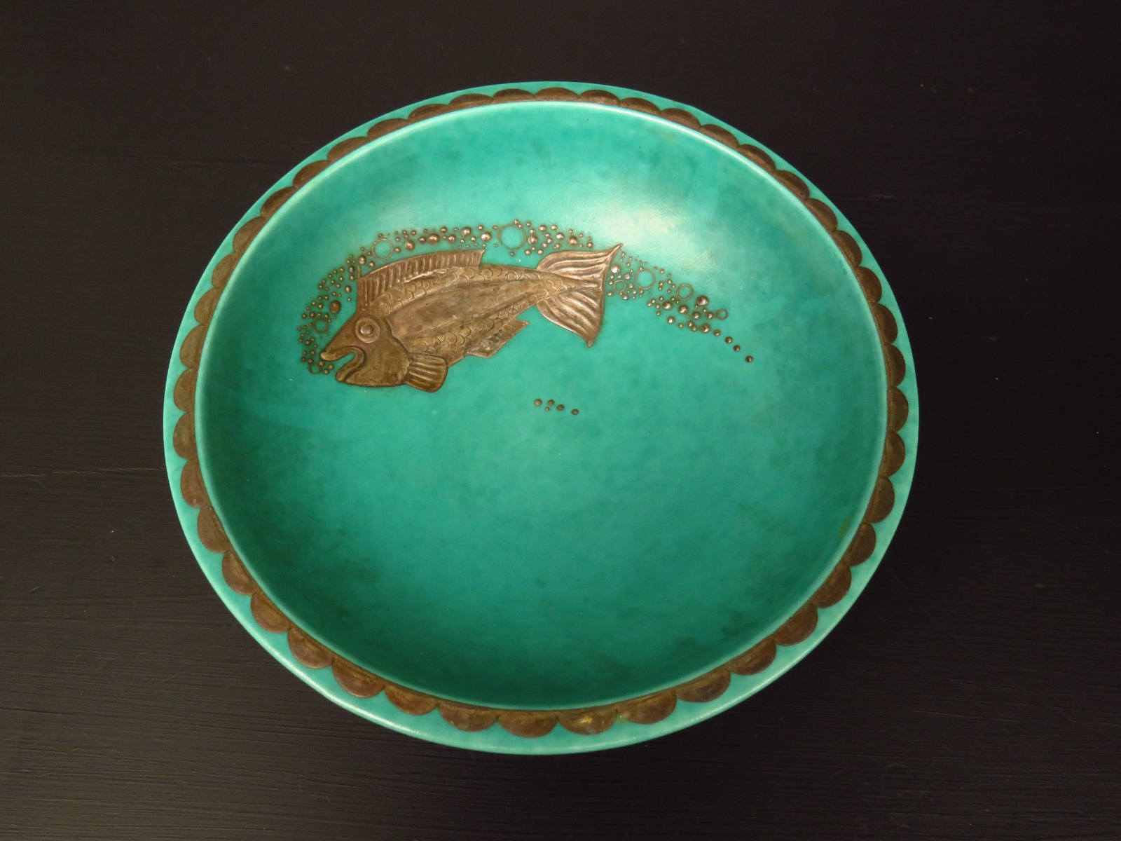 Wilhelm Kåge for Gustavsberg, Swedish Argenta Green Bowl Decorated with Fish