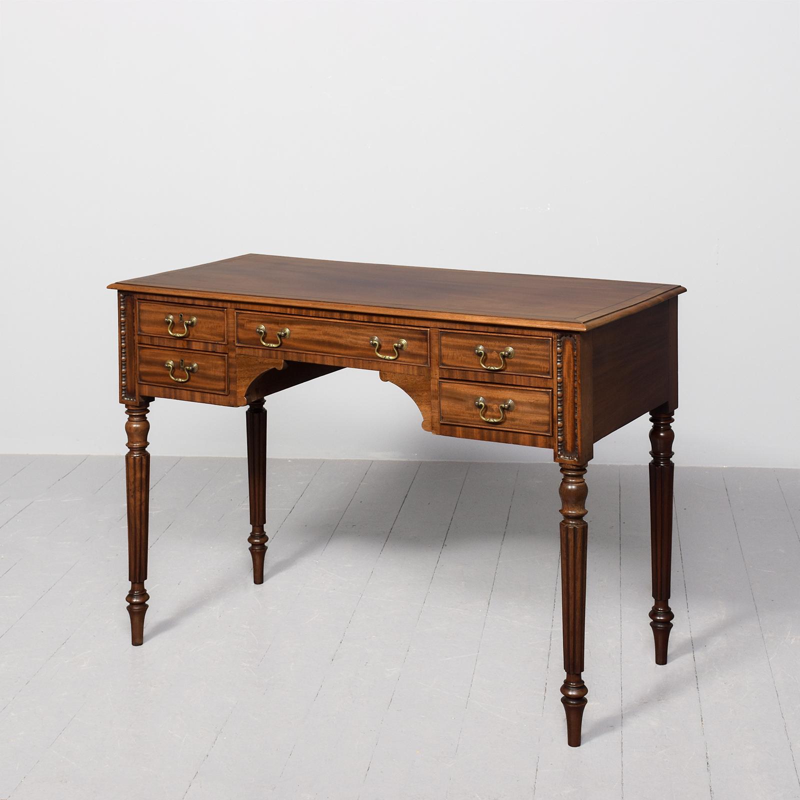 Circa 1840. William IV, Gillows-style, crossbanded and ebony inlaid side table or dressing table. The rectangular, figured mahogany crossbanded top with ebony inlay over five frieze drawers with brass loop handles and carved quarter brackets, supported on Gillows-style fluted turned legs.