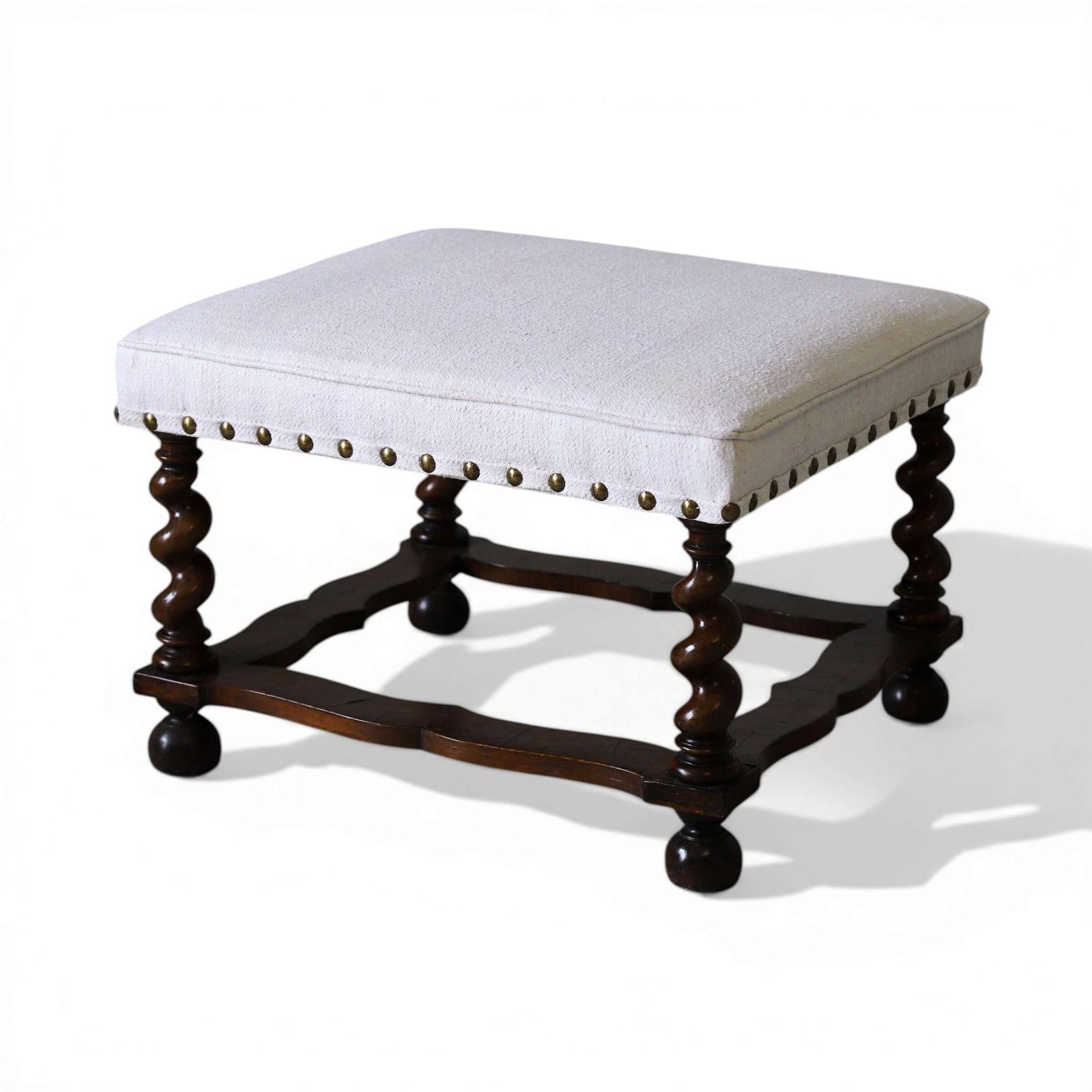 A late 17th‑century William & Mary stool with barley‑sugar twist legs, oyster‑veneered stretcher, and French linen seat - a refined, decorative piece full of early charm