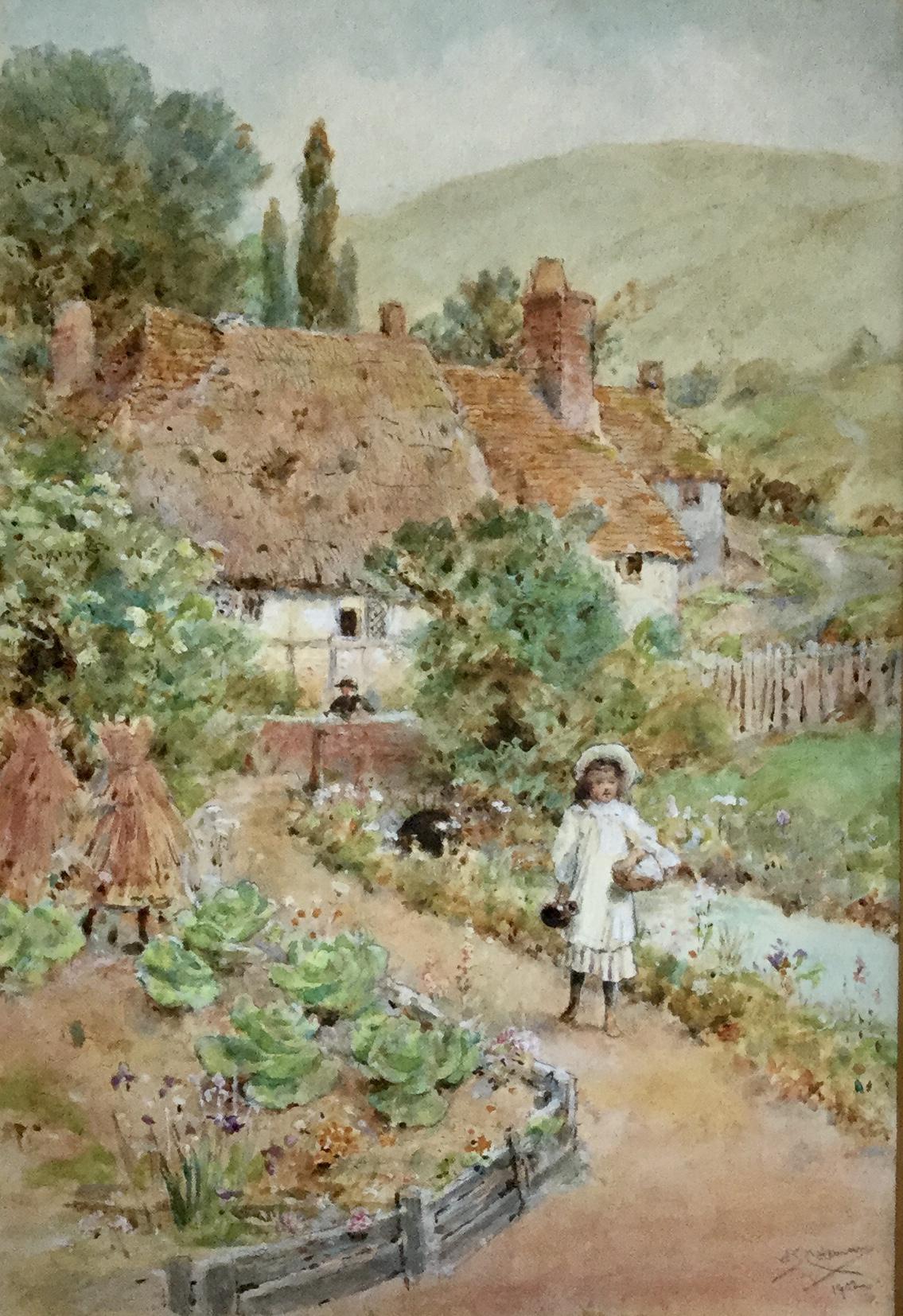 William Stephen Coleman Watercolour’ young girl in front of a thatched cottage’