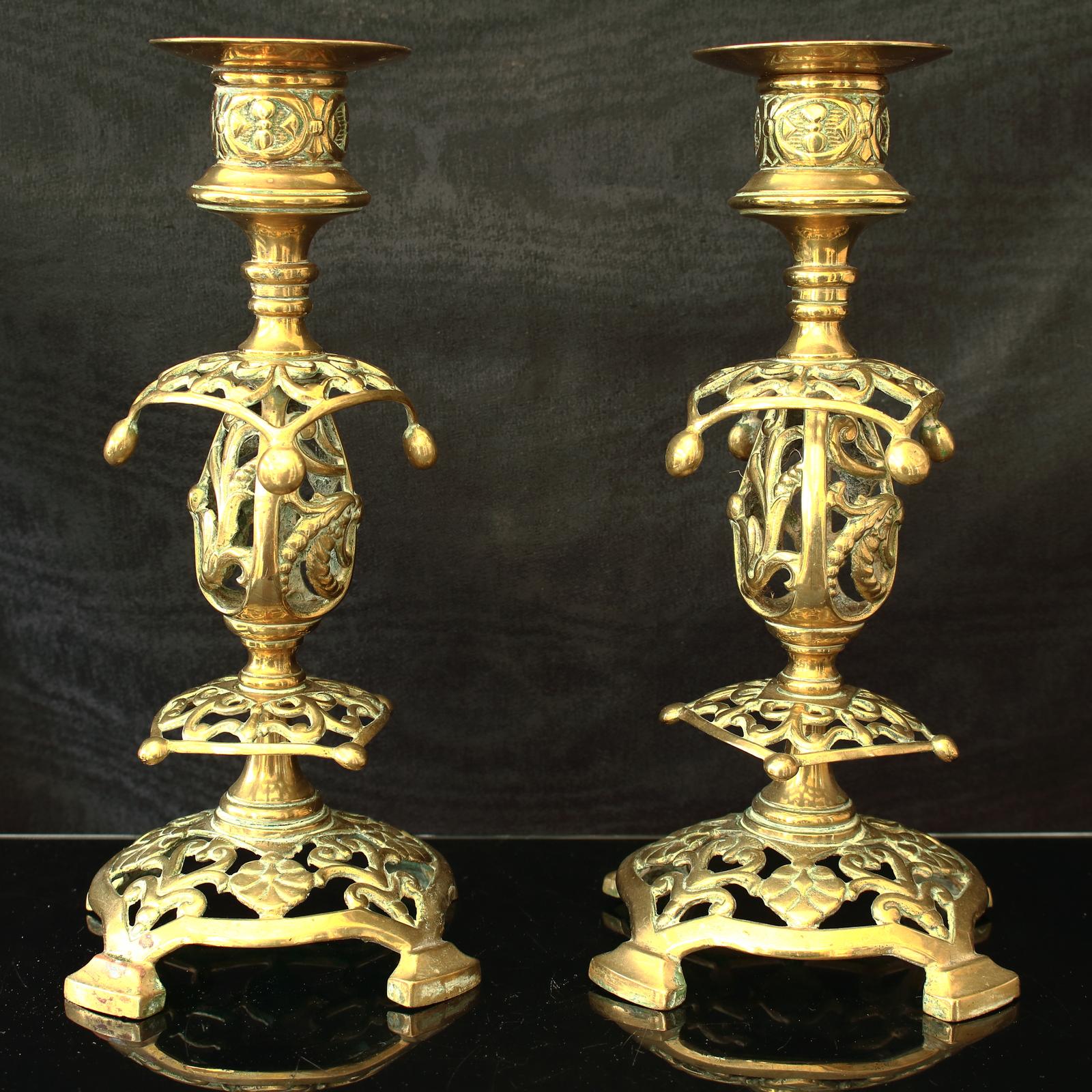 Wonderful pair of 19th Century candlesticks in pierced brass standing on four legs, barely distinguishable marks underneath W T & S and stylised sun mark revealing manufacturer as the renowned William Tonks and Sons brass founders.
