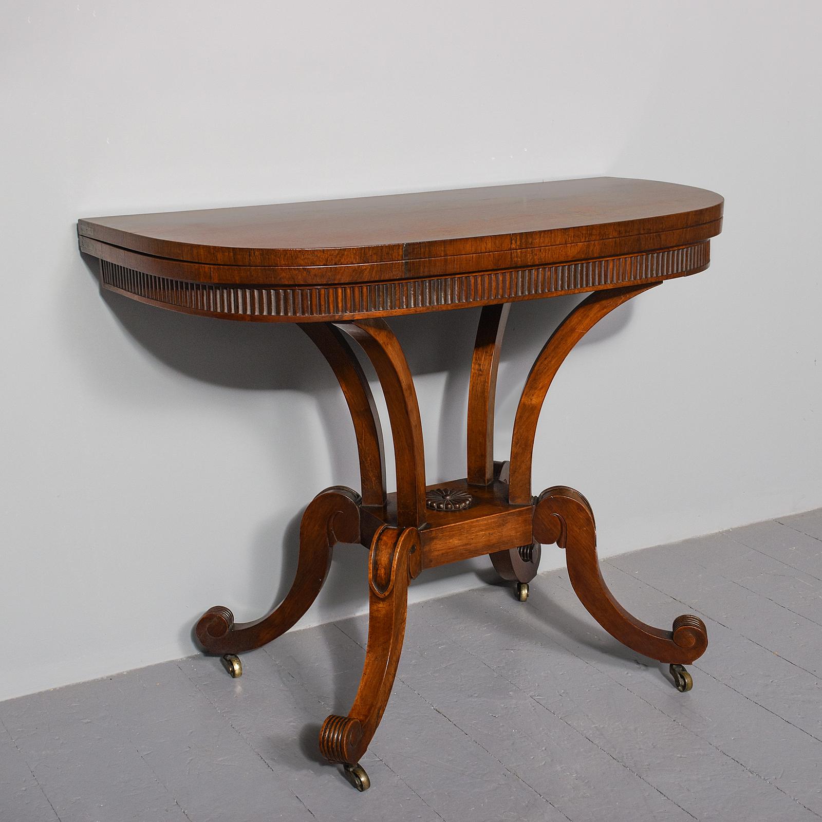 Circa 1815. A classic Scottish, Edinburgh rosewood fold over tea table by ‘William Trotter’, the D shaped top in well figured rosewood open to reveal a rich un-faded interior, the top swivels and has a small well beneath, the simple broad banded fore edge with a classic Trotter quilling in the frieze, the table is supported on four shaped uprights resting on a platform base with a carved flower head in the center, all resting on four hipped cabriole legs with carving on the top and the sides, finishing with scrolled, reeded toes with original castors beneath.