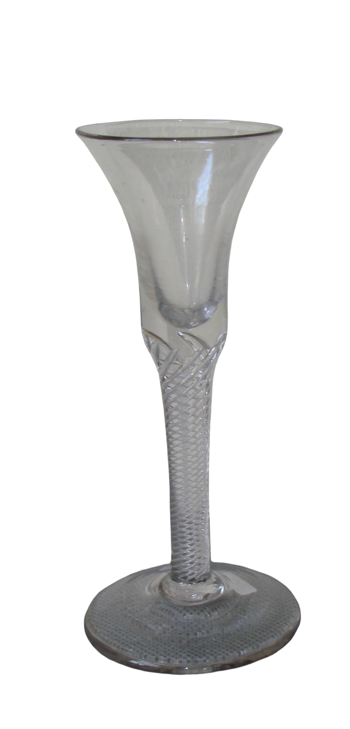 Georgian 18c. wine glass. Trumpet bowl with solid base on a multispiral air twist stem.Plain conical foot. Good condition.No chips.