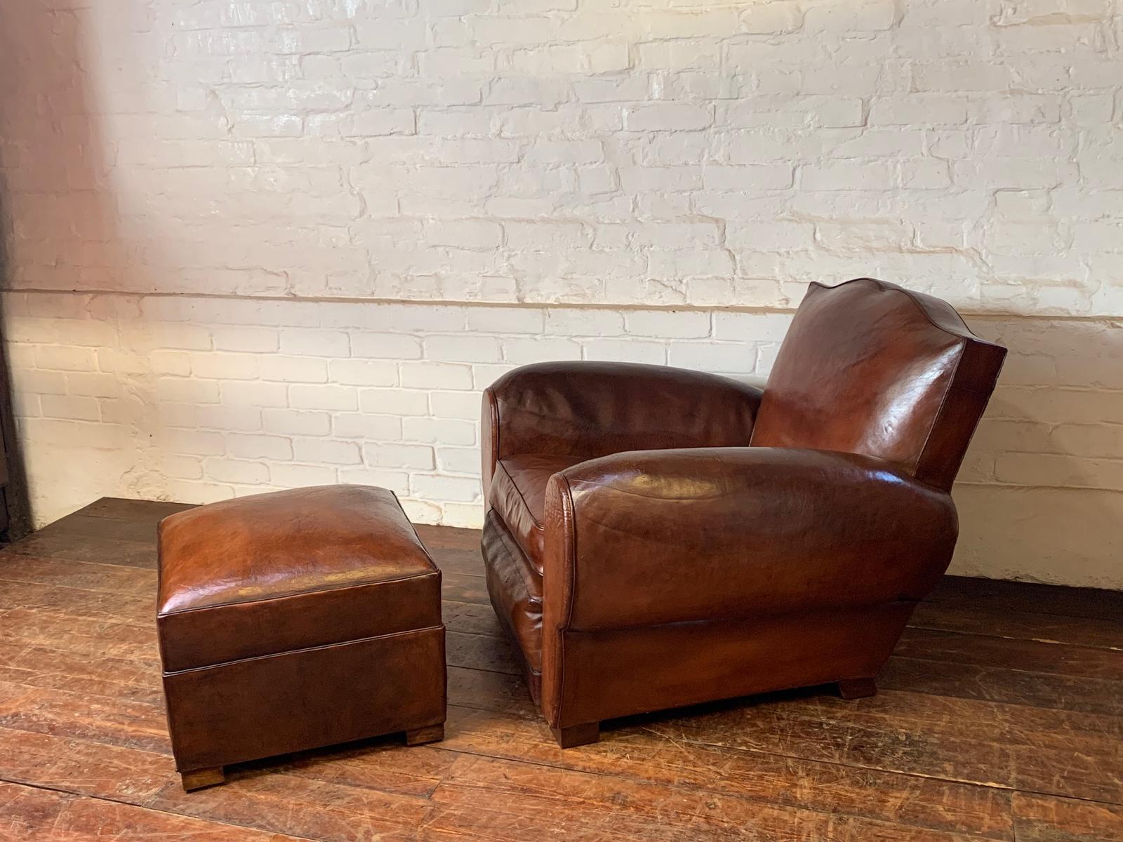 Wonderful French Leather Club Chair & Footstool - Moustache Model c.1940