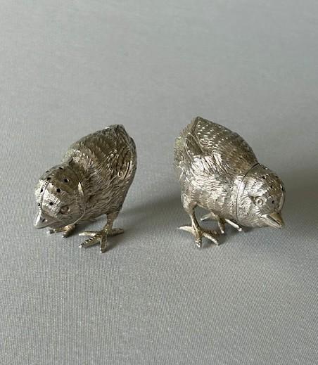 An extremely rare pair of Edwardian novelty pepper pots. These rare and unusual pieces are highly collectable and the silver is fully cast. The bodies are crafted to depict two pecking chicks, with lovely crisp detail and features. The heads pull off to facilitate refilling and they are as collectable and decorative, as they are practical.