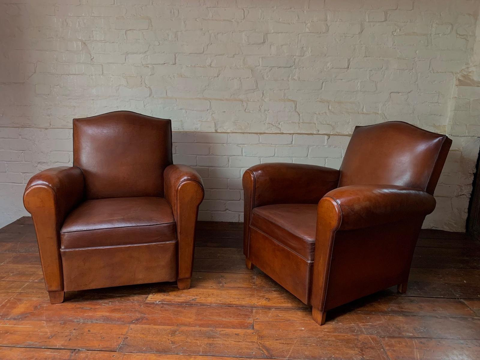 Wonderful Pair of French Leather Club Chairs, Chapeau du Gendarme Models c.1950