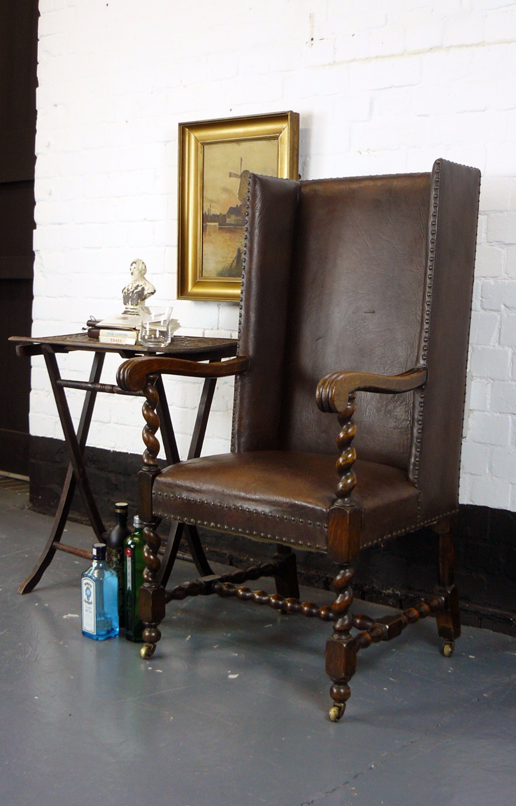 Wonderfully Shaped Early 20th Century Leather and Oak Wing Back Chair