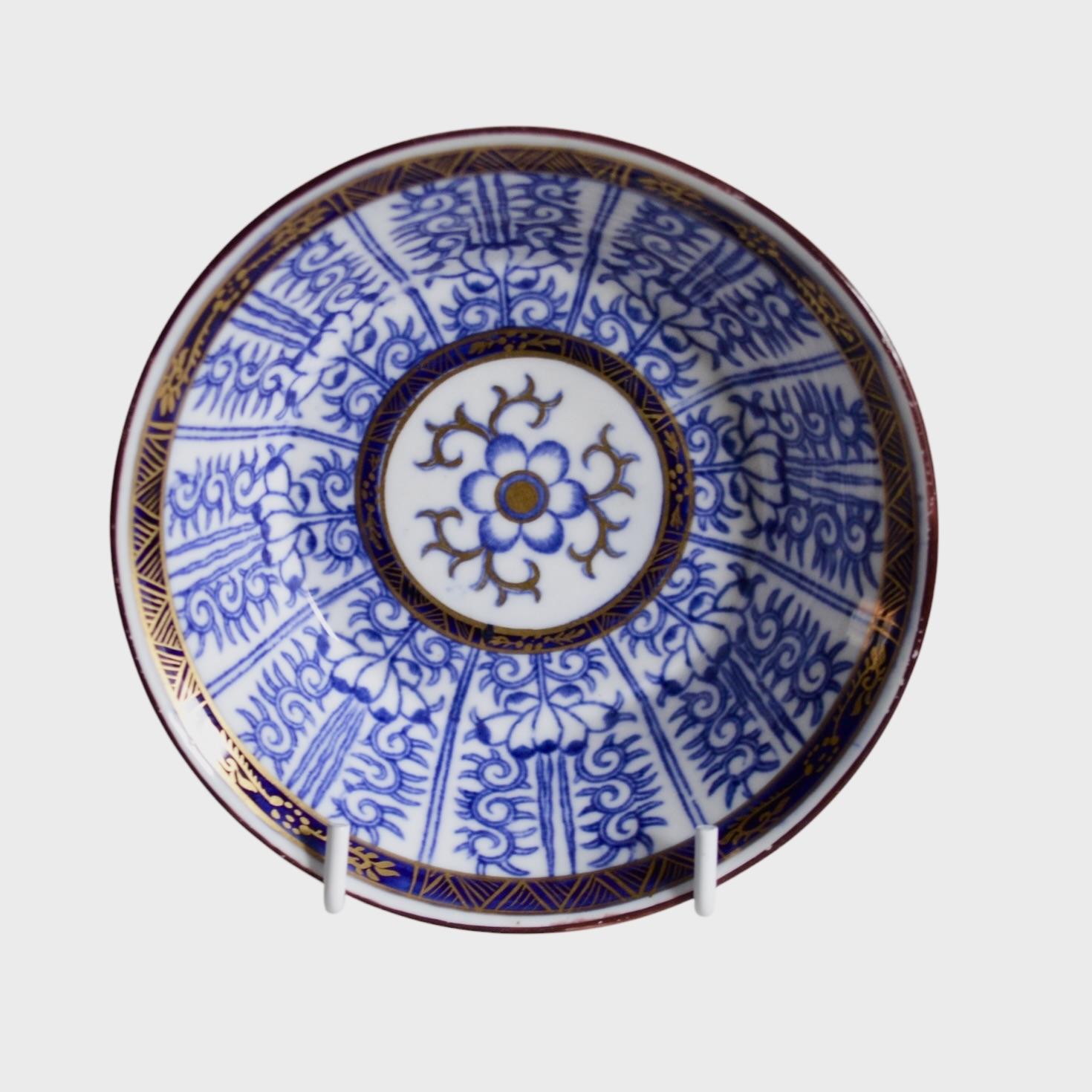 A Worcester (circa 1792-1800) Flight & Barr period porcelain saucer painted in underglaze blue with the Royal Lily pattern and with gilt borders and iron-red rim.